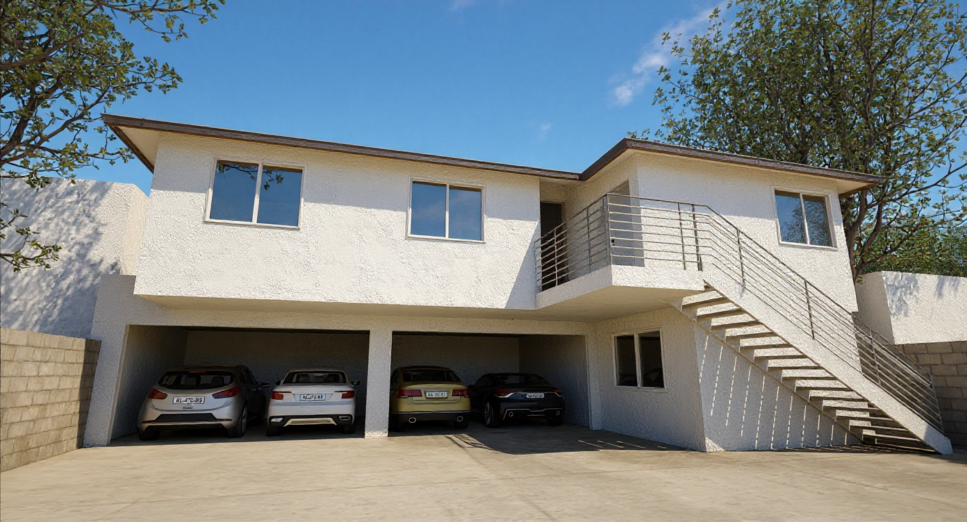 render the existing raw 3d drawing from a mid level aerial angle above the sea offering a balanced view of the building complex the surrounding tent roof neighborhood and the dry forest hills behind do not change or add any geometric elements from the original 3d model add trees and vegetation around the complex and depict the natural dry forest hillside characteristic of labuan bajo behind the buildings in the foreground show the sea with the jetty clearly connecting to the complex keep realistic tropical lighting and the coastal dry forest atmosphere