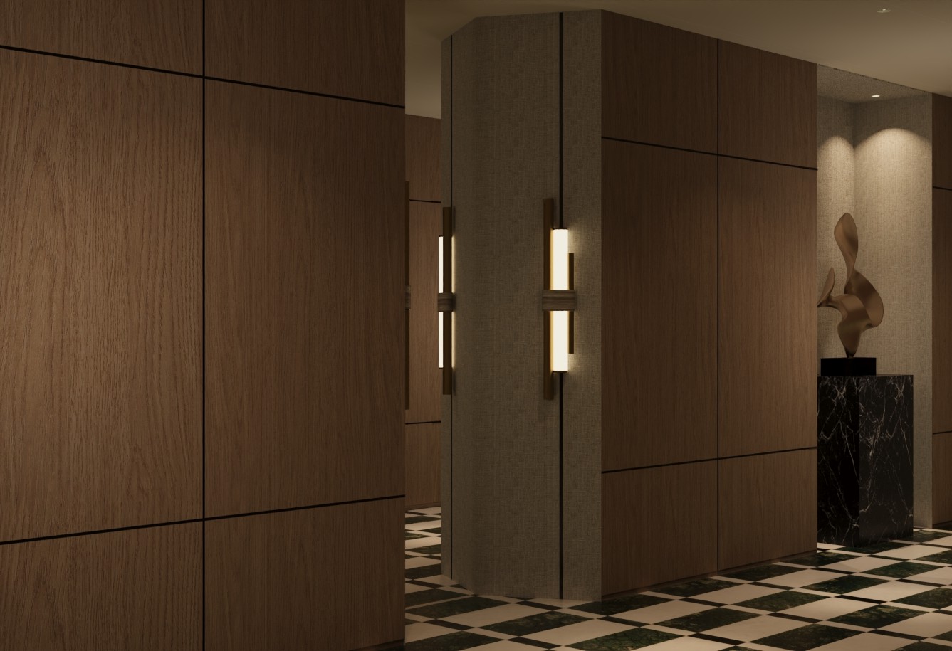 transform the provided corridor interior image into a high end photorealistic render with high end sophisticated warm moody lighting expressing luxury atmosphere while keeping everything exactly the same there is no sunlight or natural light and no windows keep all architectural elements colors and design as they are do not change or add anything different from the design provided enhance lighting keep marble block black the flooring is beige and dark olive or army green marble same pattern as the image wall paper are light grayish beige keep wood color the same medium brown wood no cartoonish look keep overall atmosphere moody sophisticated and realistic make wood lighter reduce exposure reduce shadow effect and contrast increase overall brightness of the image the metal part of wall light is gold reduce exposure just a little reduce brightness a little