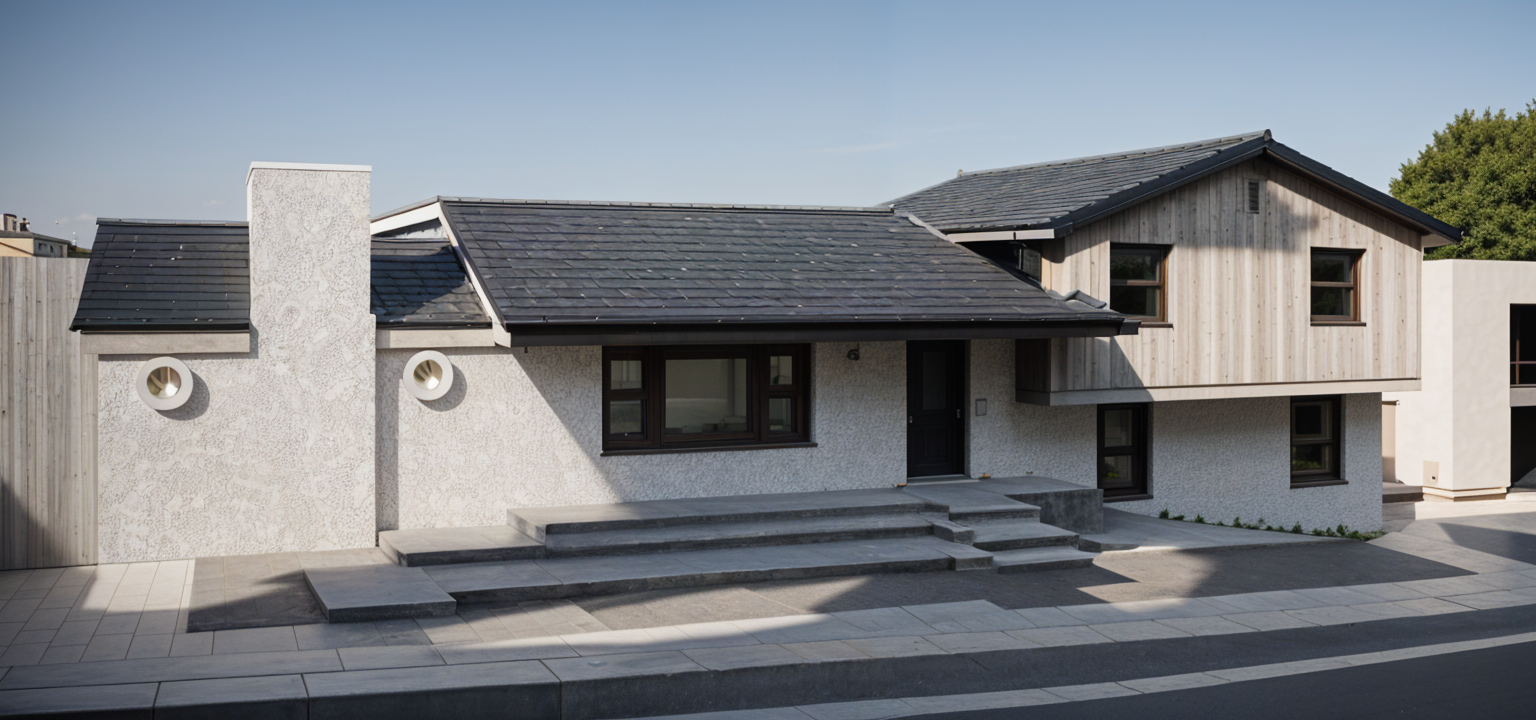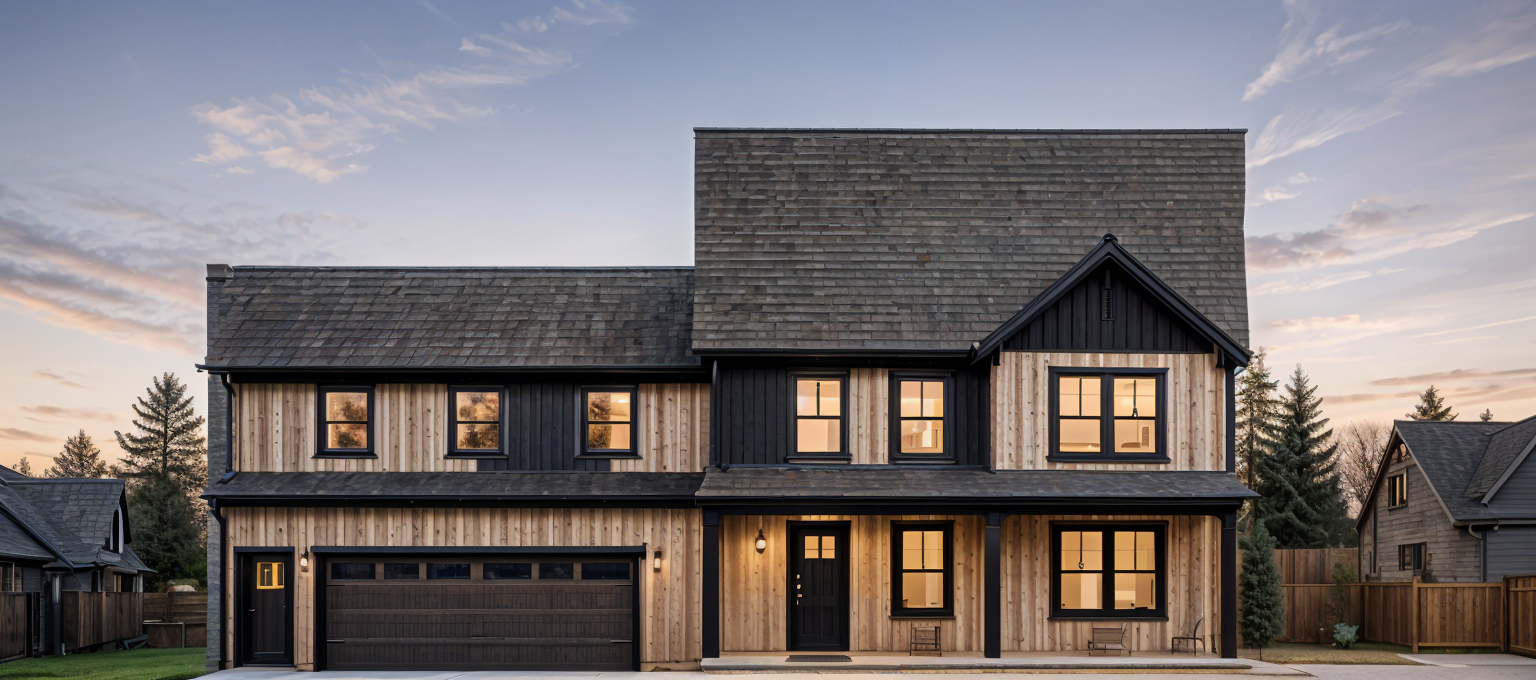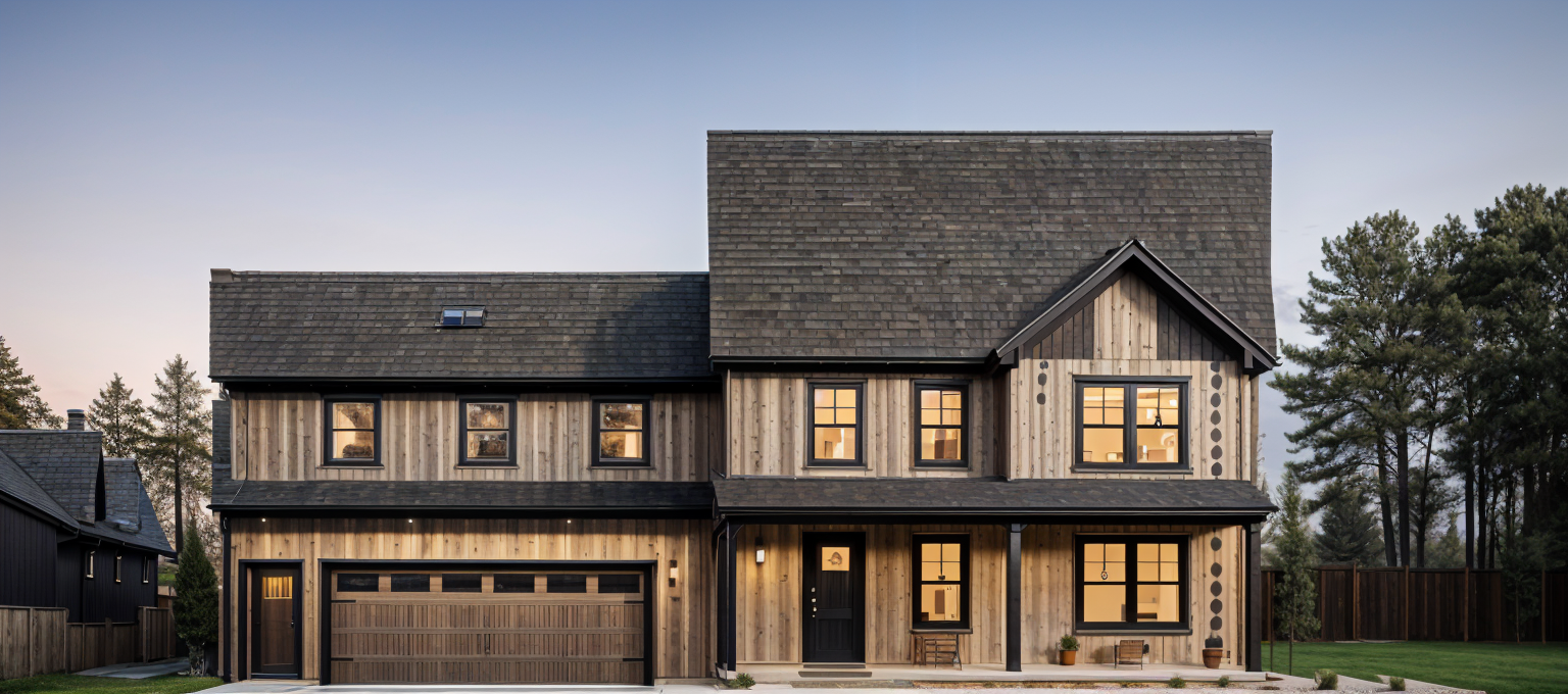 exterior shot try to replicate the clerestory windows keep the wood color panel as smooth not rustic no winter scene