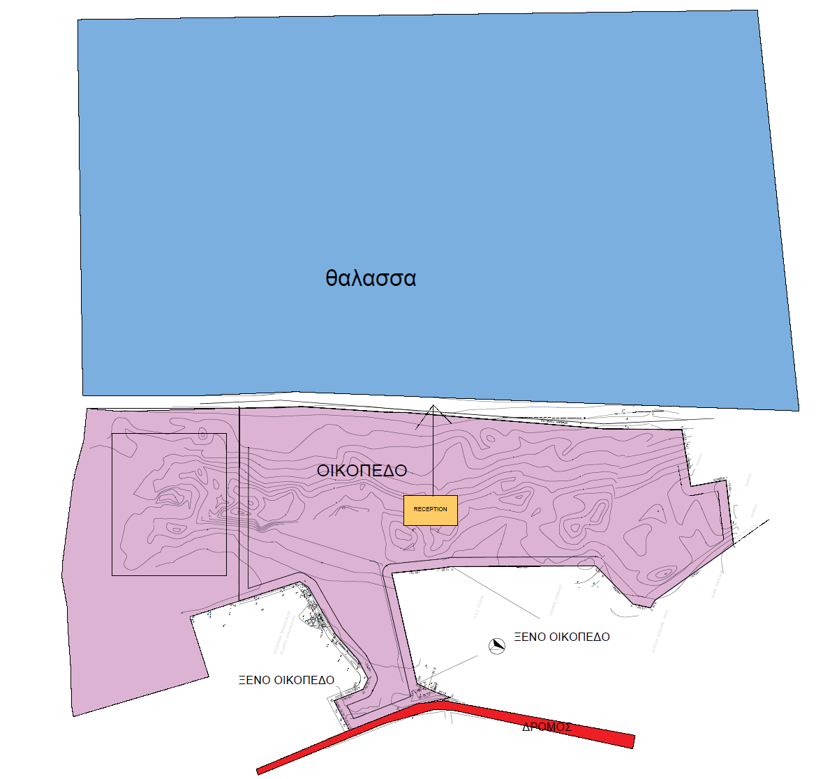 modernist exterior shot aerial view of a serene coastal region featuring a vibrant blue sea meeting a pastel pink landscape the main area labeled oikopedo is a lush verdant green with gentle topographic lines giving depth and texture the reception area is highlighted with a warm inviting yellow surrounding areas labeled oikopedo appear in a subtle sandy beige contrasting with the deep red path labeled that cuts through the terrain the atmosphere is peaceful and idyllic with a slight haze over the horizon where land meets the sky evoking a sense of tranquility and harmony architecture