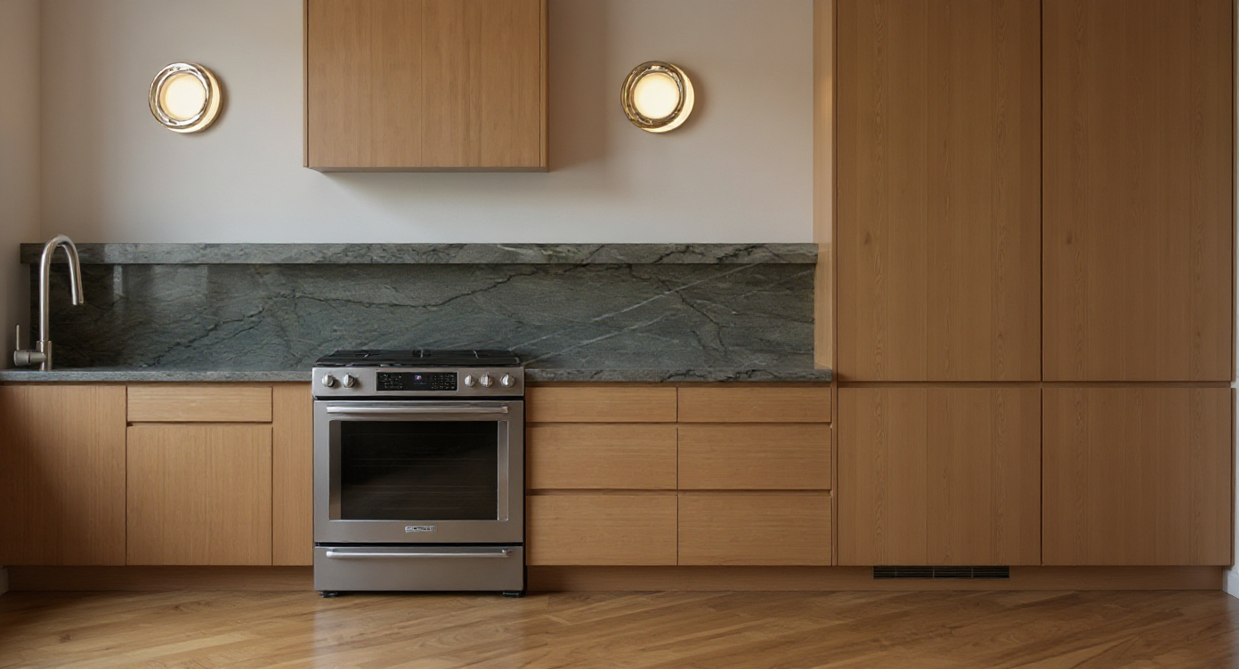 render a modern architectural design of two adjacent houses with a sleek minimalist style the left house features a muted beige exterior light wooden paneling on doors and a glass balcony while the right house is predominantly white with rounded wooden slats on the side both houses have large glass windows reflecting a clear blue sky set in a serene atmosphere create a soft gradient sky transitioning from pastel pink to light blue at the horizon the overall scene should convey a sophisticated and tranquil ambiance architecture