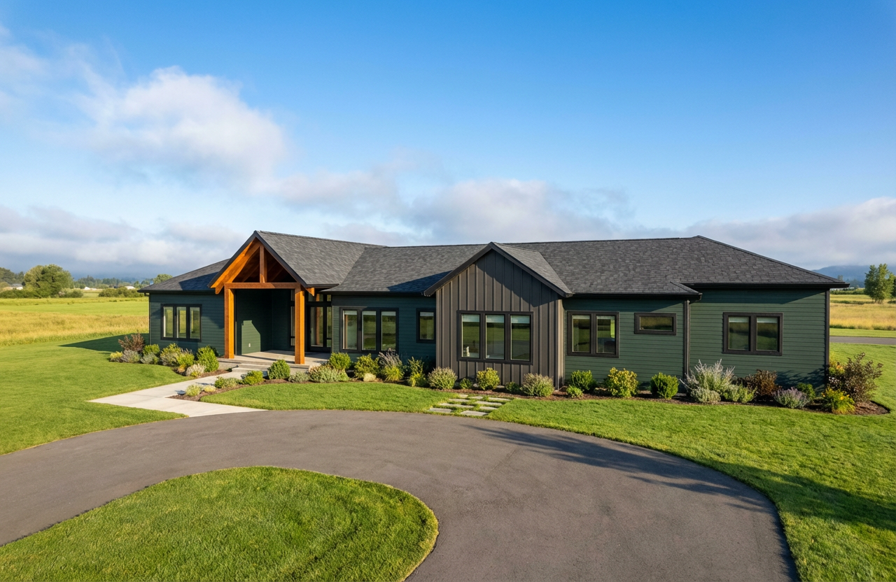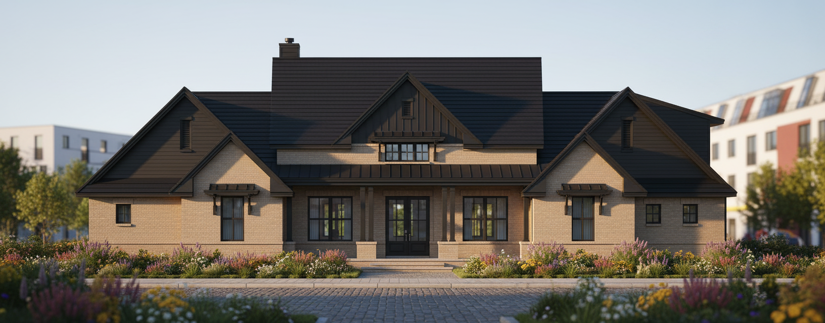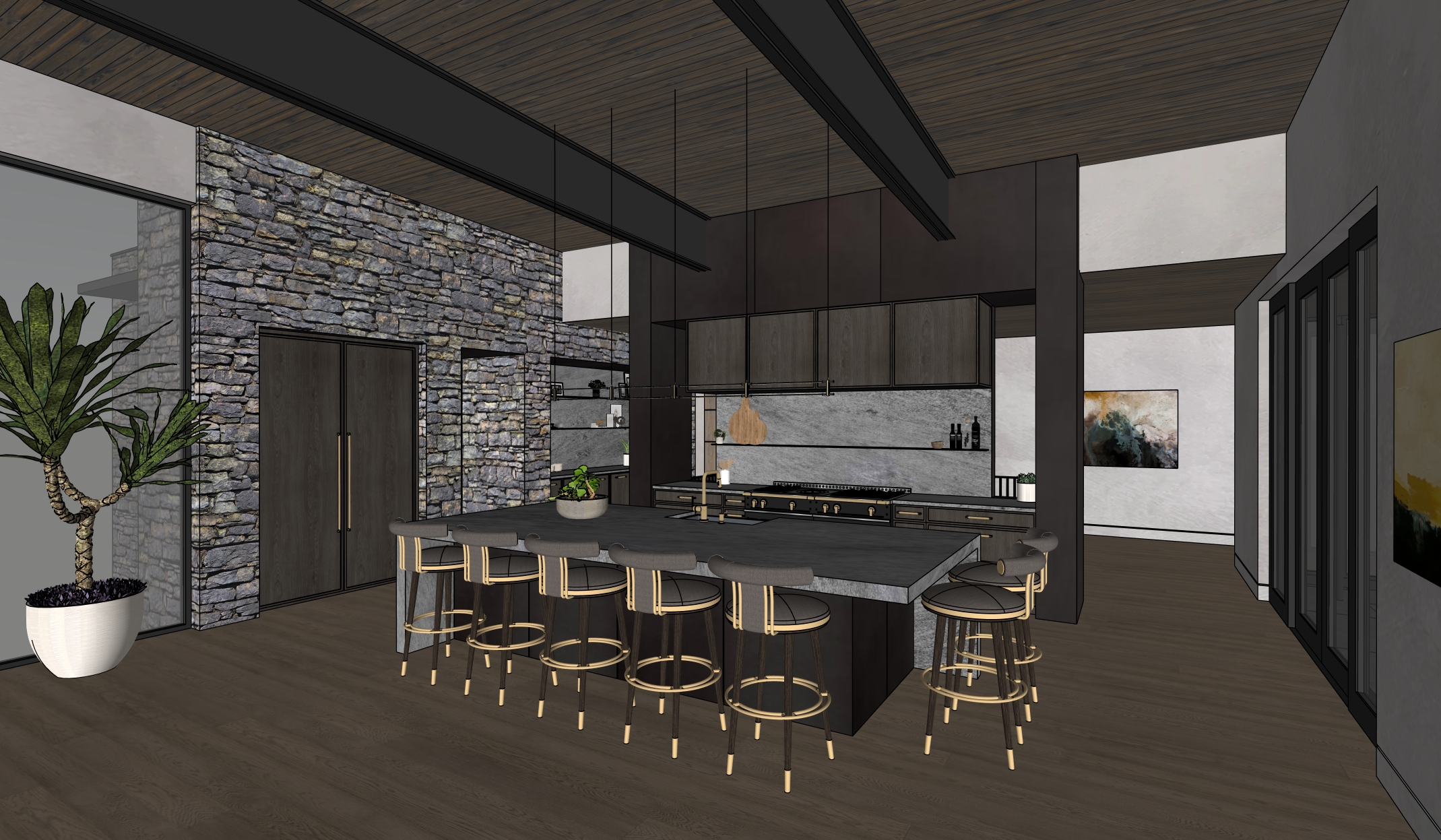 do not remove or change any geometry in image rough hewn tennessee fieldstone stained straight grain white oak tongue and groove ceiling dark metal window frames cold rolled steel beams blackened steel wall panels around kitchen range wall and above upper cabinets soapstone countertops and backsplash at range wall and shelving beyond dark stained walnut wall paneling above range dark stained walnut cabinetry above cabinets light coming from linear pendant above island smooth finished stucco walls sparse native plants outside overcast sky afternoon light coming from windows on left side of kitchen add square can lights to ceiling no hardscape visible through windows