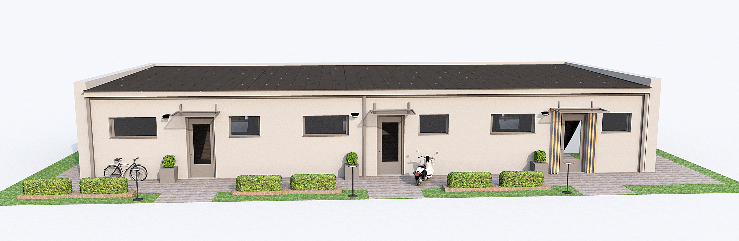 render a contemporary duplex house with a light beige exterior facade and a dark brown flat roof include medium sized windows with dark gray frames feature a modern front entrance with a sleek awning above the wooden front door set against a paved pathway in a neutral gray tone surround the house with well maintained green bushy hedges and a small patch of lush green grass place a stylish black and white scooter and a black bicycle near the entrance ensure the scene is set in a calm and serene atmosphere with soft natural lighting highlighting the minimalist and elegant design of the house