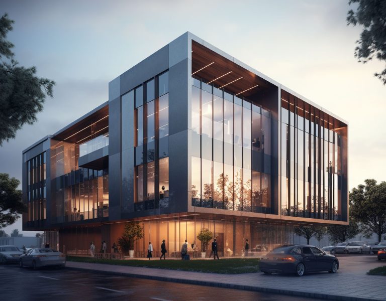 exterior shot a modern architectural building with sleek glass panels reflecting the sky bathed in soft golden sunlight the lower structure is adorned with light gray concrete and subtle dark steel elements surrounding the scene incorporate lush greenery with vibrant green bushes and trees the atmosphere is serene and professional with a hint of futuristic elegance