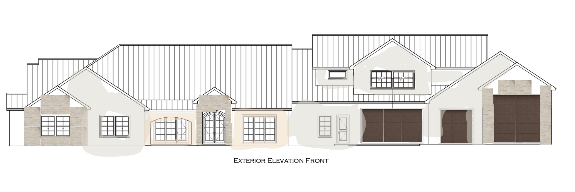 where there is stone add a creamy cobble stone with variety of light browns where it is peach add painted brick grey creamy brick garage doors no windows have them be a dark brown and the roof black windows and doors black no windows in garage keep the structure the same do not move the windows or garages or roof lines