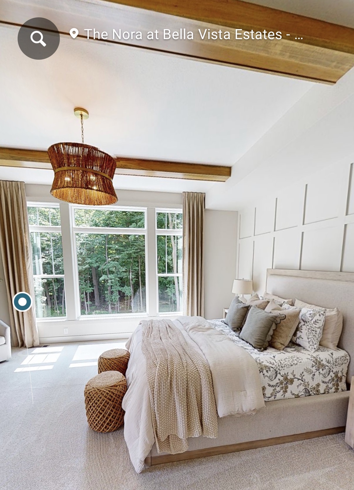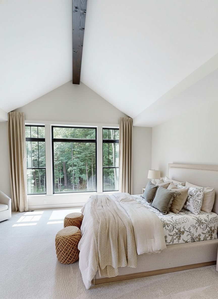 remove the beams change the windows to black change the ceiling to cathedral with a beam down the middle at the peak bedding and curtains should be white change the chandelier