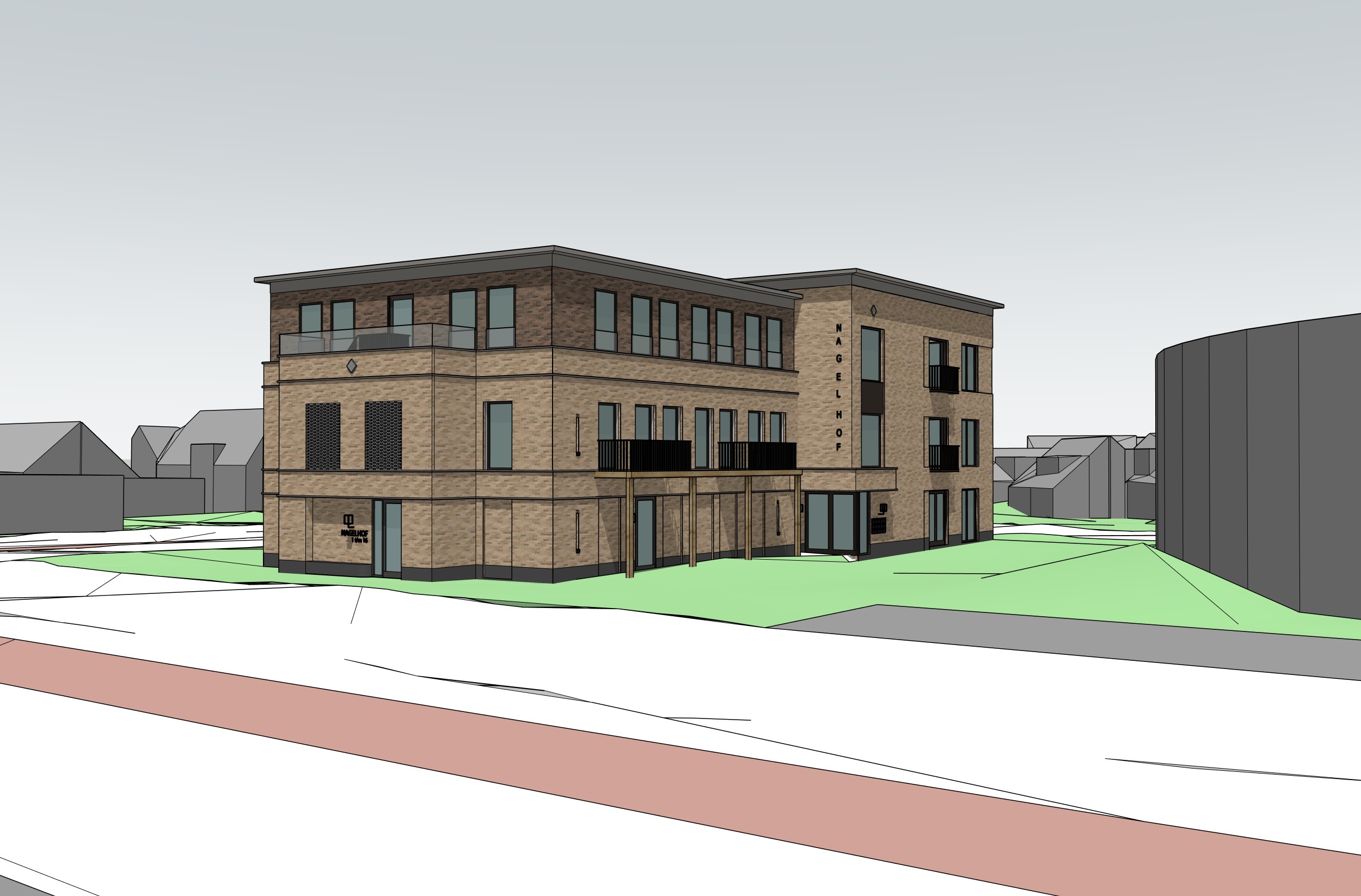 add trees bushes and some flowers around the building and add a lot of people on and around the building the weather is sunny with a few clouds keep the materials and colours of the building the same