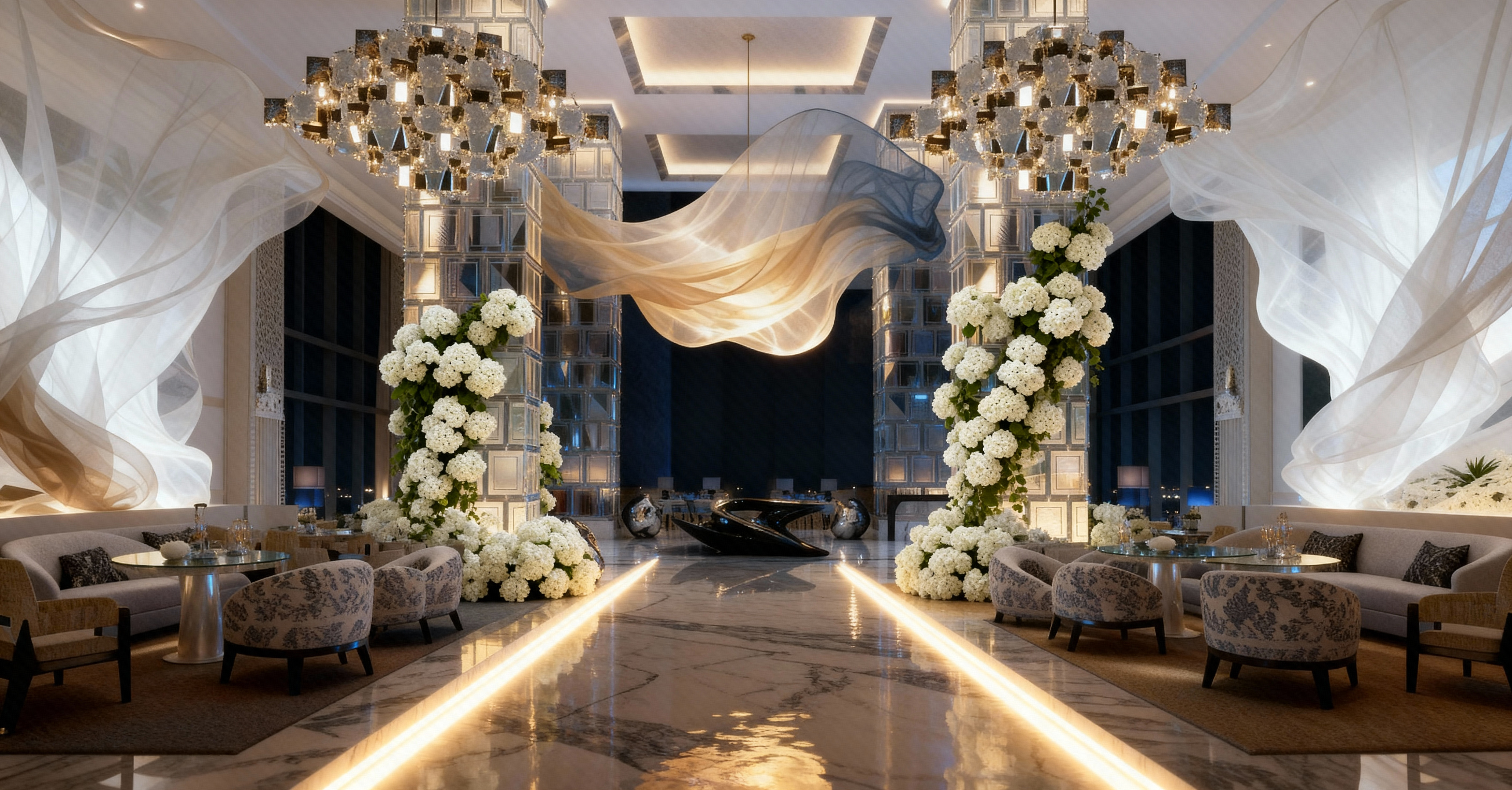 recreate the exact same 3d composition proportions camera angle materials and lighting as in the reference image do not modify or move any existing element keep every architectural detail reflection furniture piece and light placement exactly as they are remove all the green foliage from the floral arrangements around the columns keeping only the white flowers the white floral compositions should still climb partially up the columns but not reach the top preserving the same natural volume and balance maintain the same lighting warmth soft reflections and overall atmosphere do not alter the fabrics materials or light positioning output ultra realistic 4k render identical to the original scene except for the removal of green foliage
