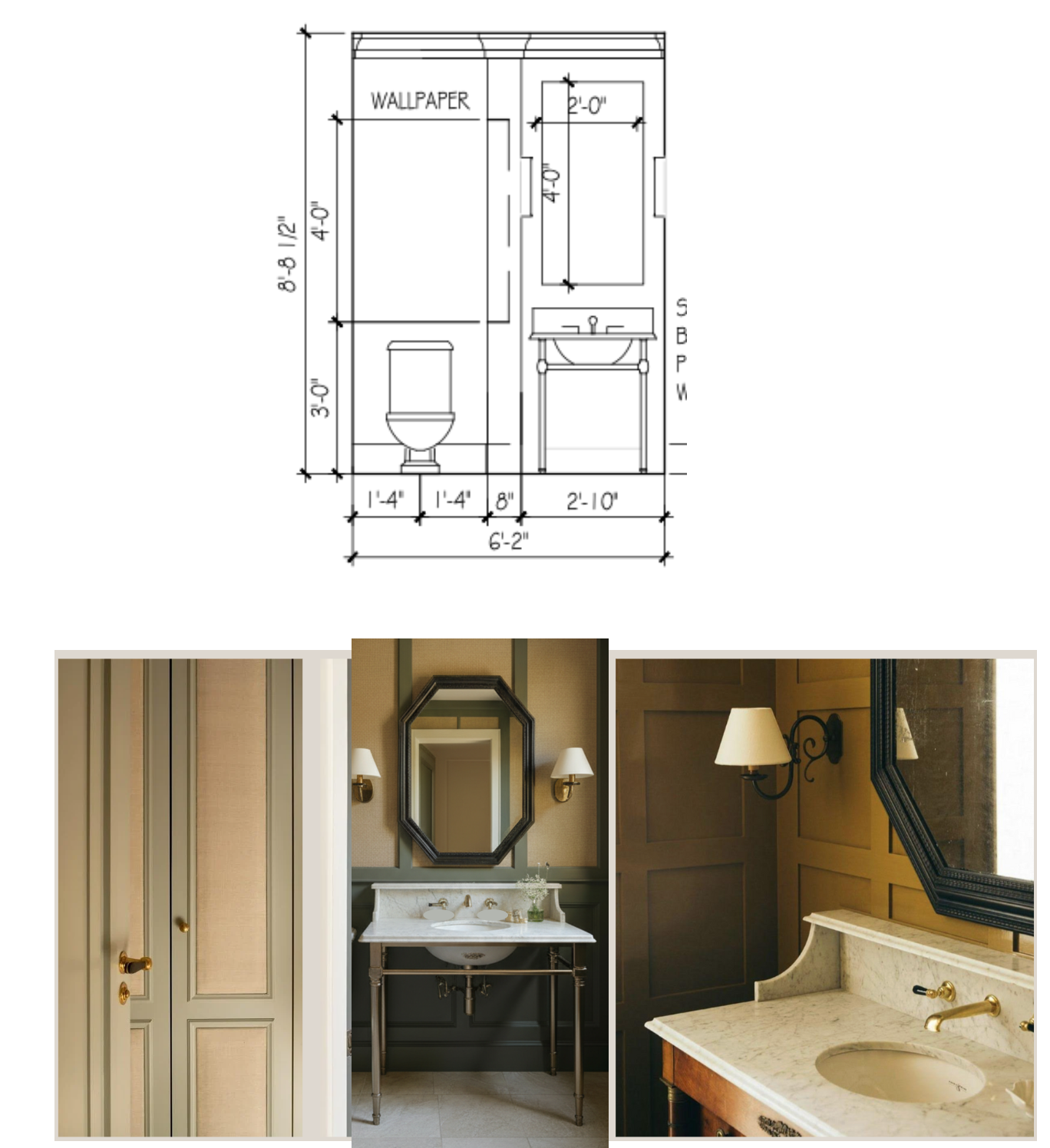 create a rendering based on this elevation but change the sink faucet to wall mounted on a backsplash with a shelf above it wall paneling and grasscloth wallpaper elevated traditional space floor is warm wide plank white oak sink is a polished nickel base with a marble top wall mounted polished nickel faucet on a backsplash with a shelf ledge above the sink backsplash curved stone sidesplashes on the sink add accessories onto the console hand towel holder on the sink countertop bud vase of white peonies glass candle on the ledge