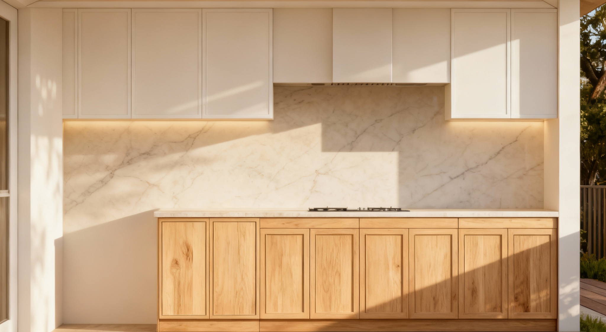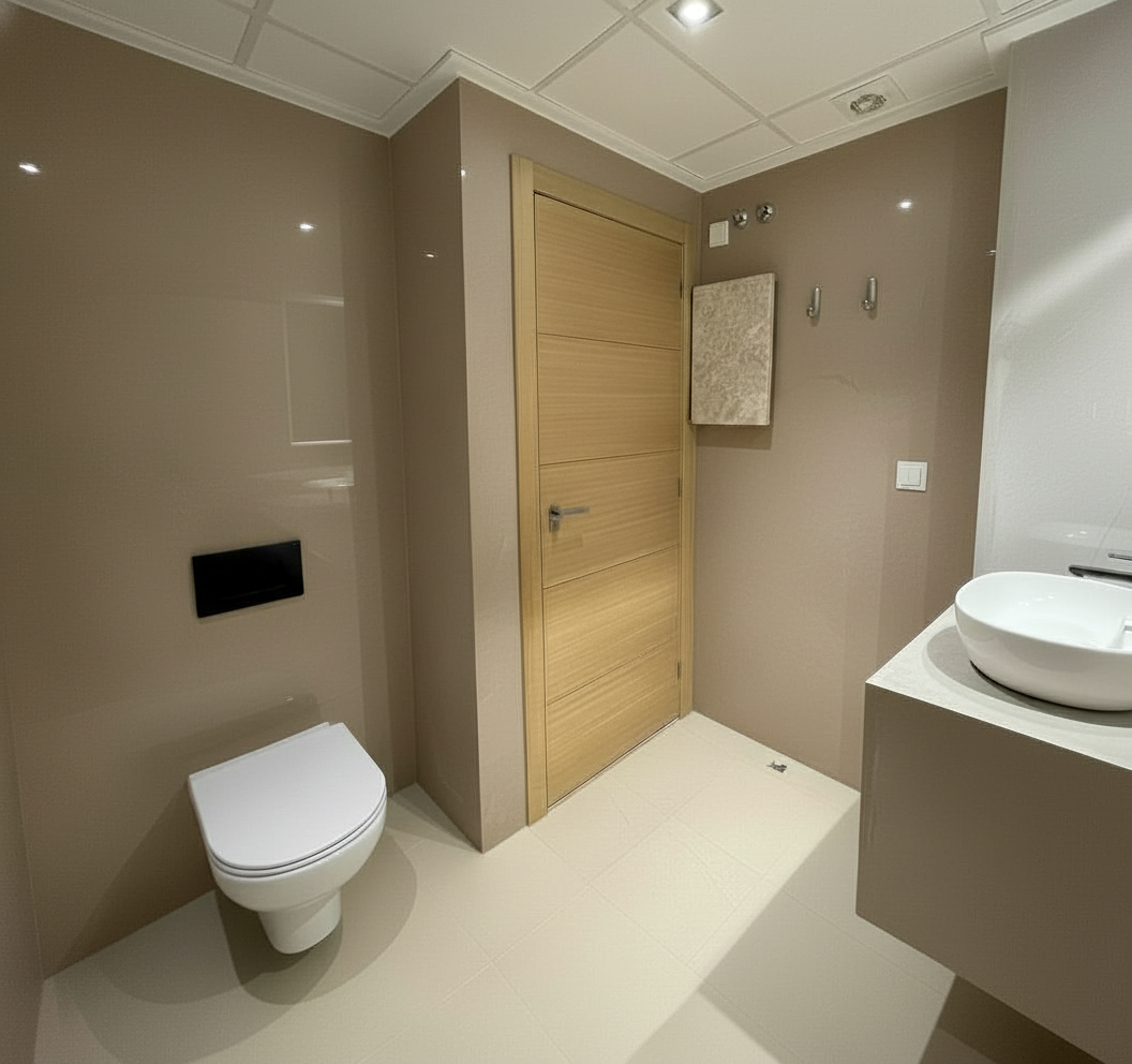 reviste de microcemento en color topo el plano vertical que hay junto al lavabo en el lateral derecho de la imagen