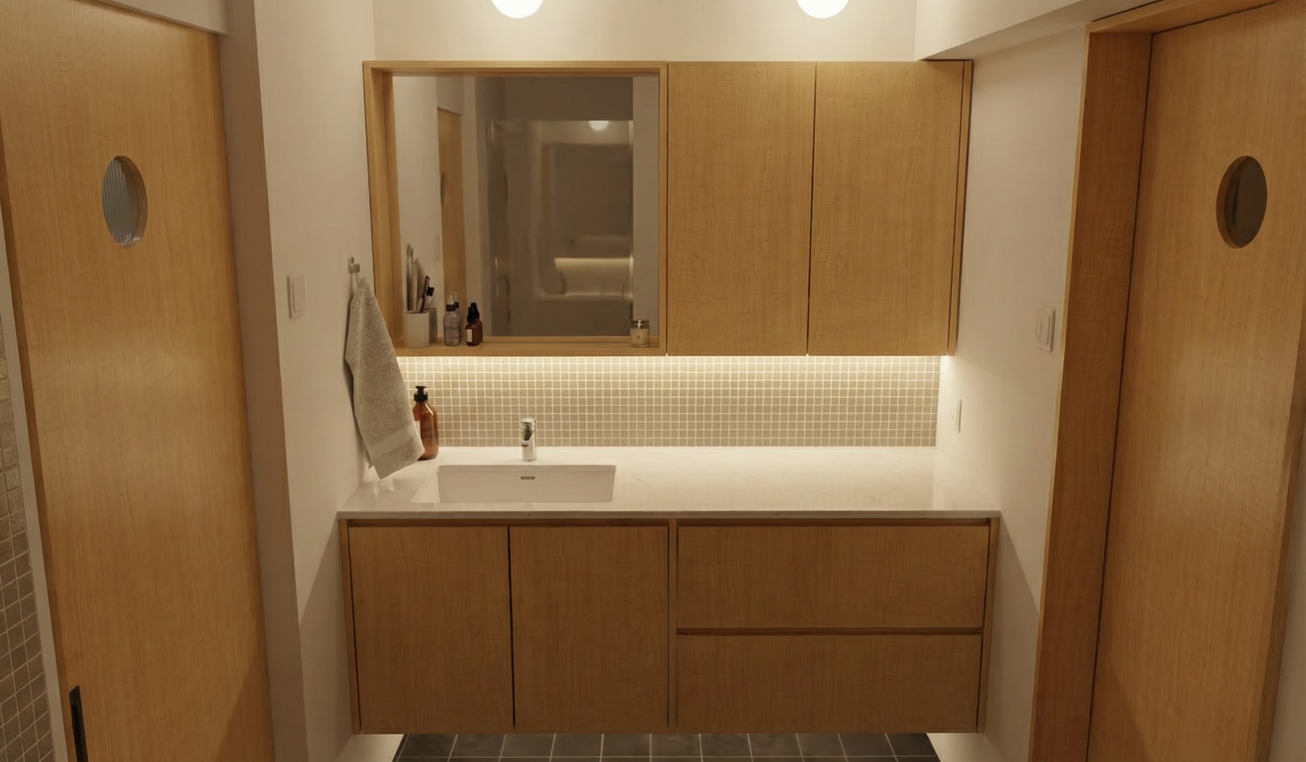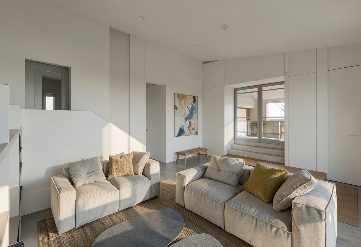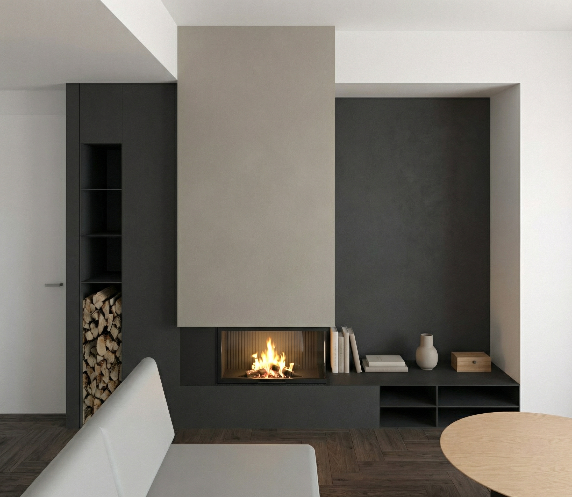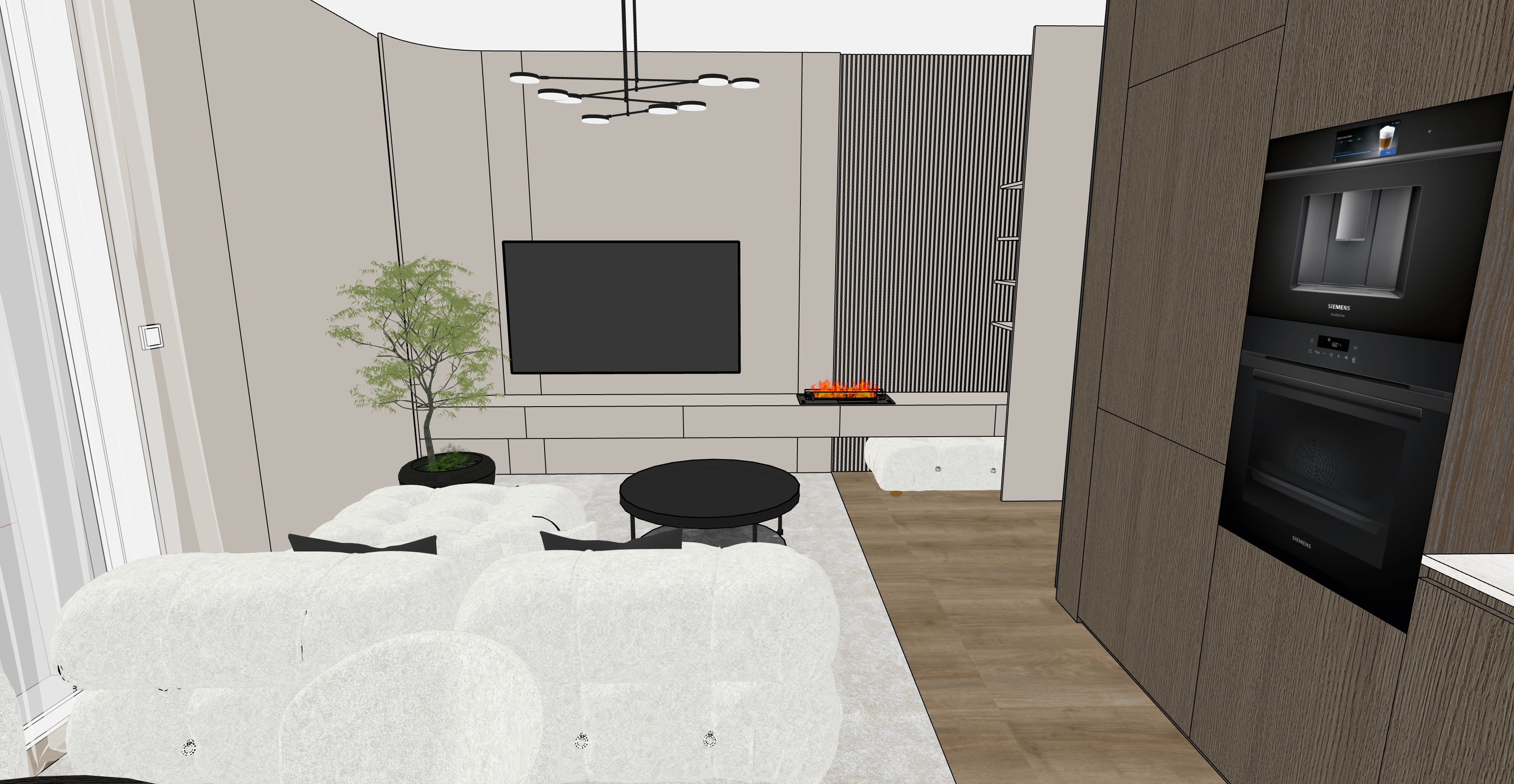 turn the ceiling lamp on 35000k the drawer under the tv and the lamellas the same color as the wall behind add one led light shining from behind the bend wall on the left