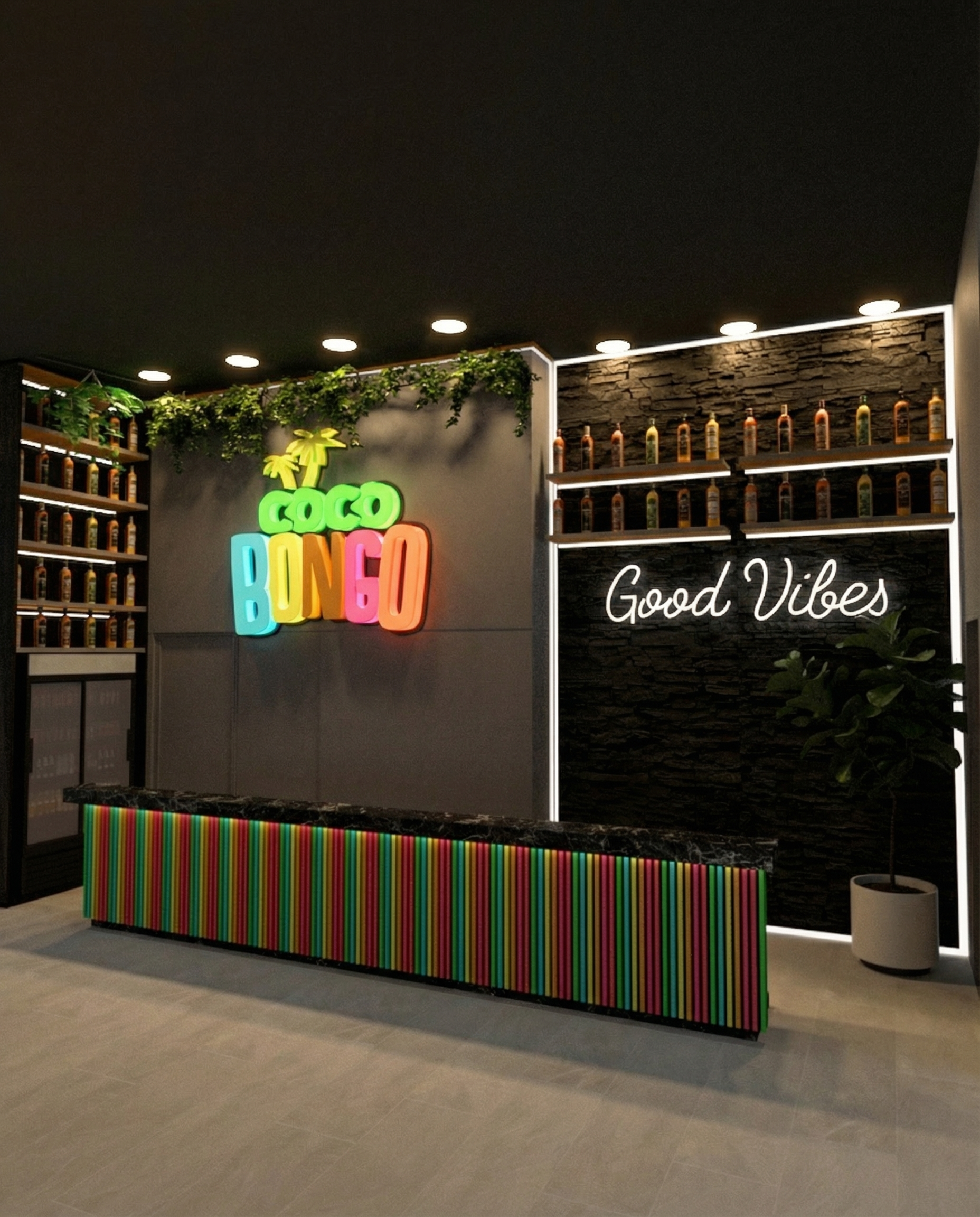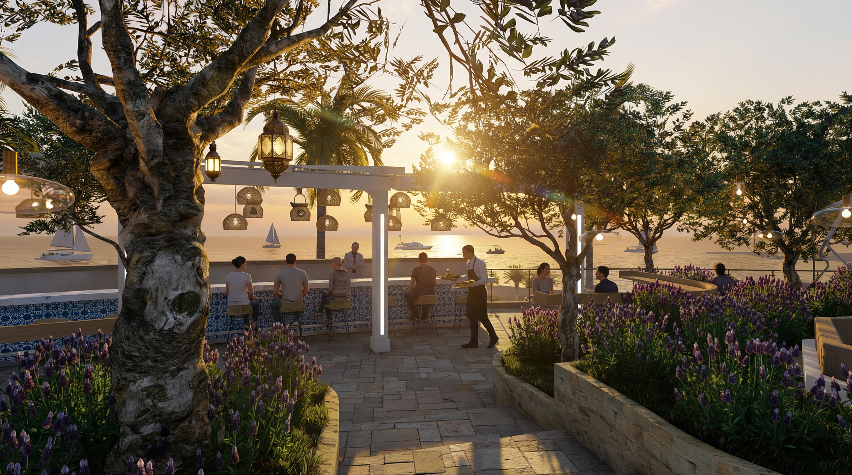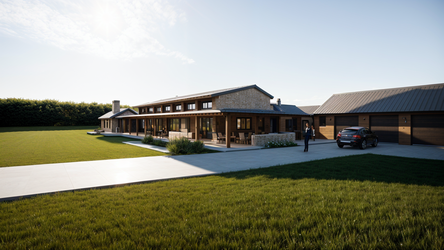 this is a resort restaurant enhance the scene by making it look a bit lived in make grass look more realistic add vry few trees to the compound retain roof texture give the outdoor furniture better design but should still be dining sets of 4 people and some potted plants few around the curved patio maintain everything else shapes design colours as they are