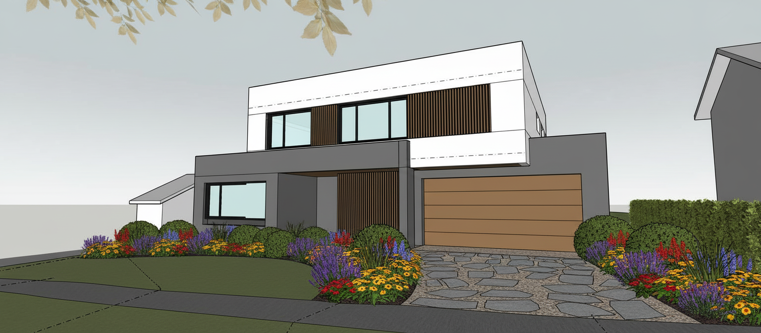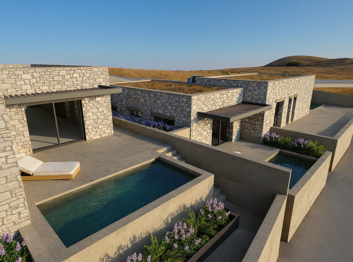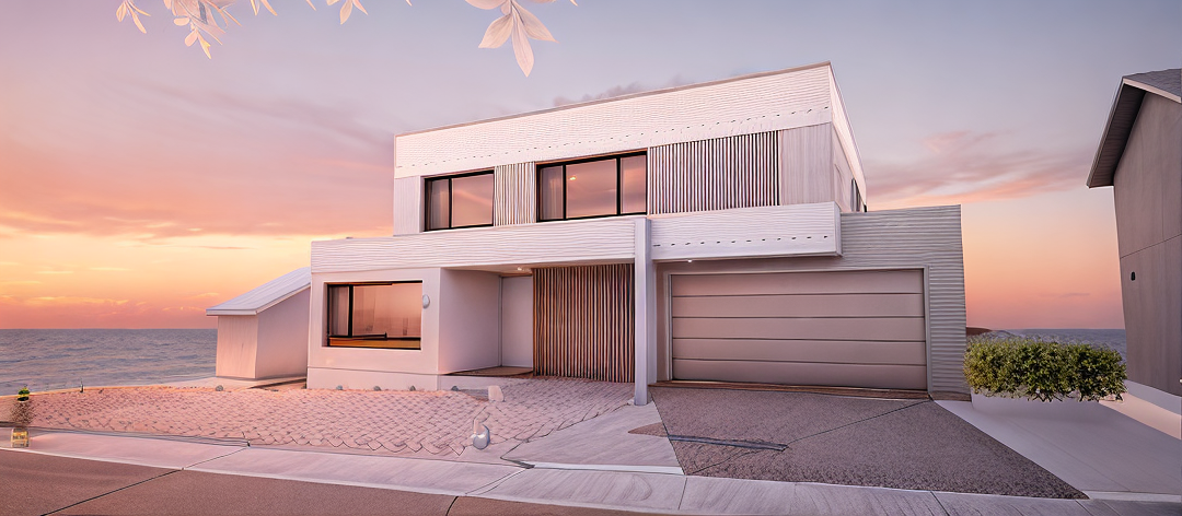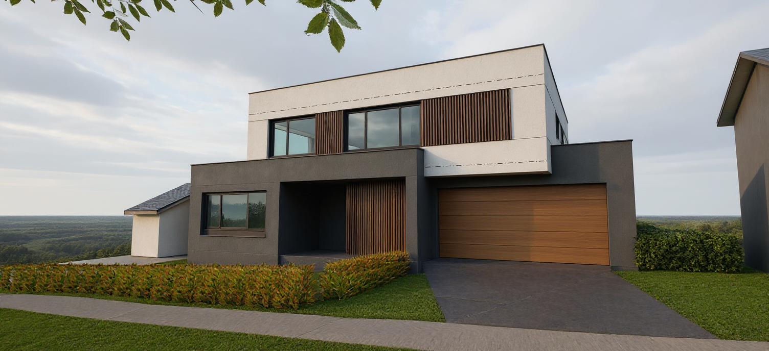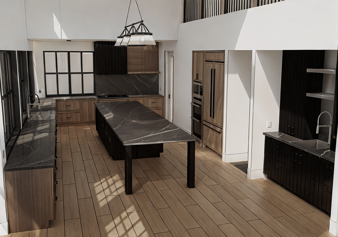 exterior shot a beautifully rendered modern kitchen with a high end sophisticated atmosphere use dark rich wood tones for the cabinets and island the countertops should be textured honed black marble with subtle white veining the floor is elegant light oak wood with a smooth finish incorporate large windows with black frames allowing natural light to flood the space creating a warm and inviting glow use soft ambient lighting with modern minimalist fixtures the walls are a crisp clean white to enhance the brightness add subtle metallic accents in silver for the handles and faucets to complete the luxurious look make shelves a dark rich wood tone add tree and lake view to window views architecture