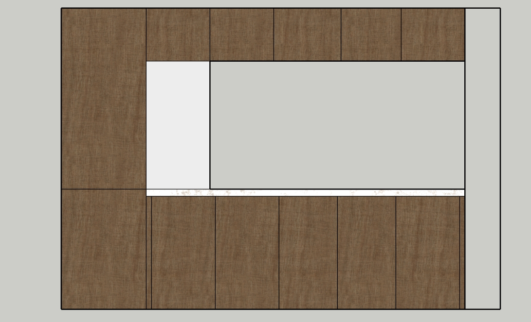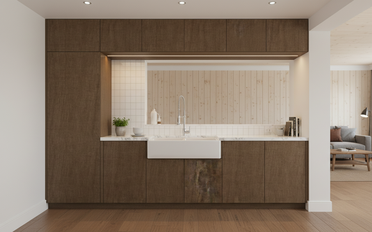 make this kitchen elevation into a realistic 3 dimensional image the cabinet on the left is a pantry add a vintage sink the opening in the kitchen wall should look out into a living room with vertical pine shiplap walls
