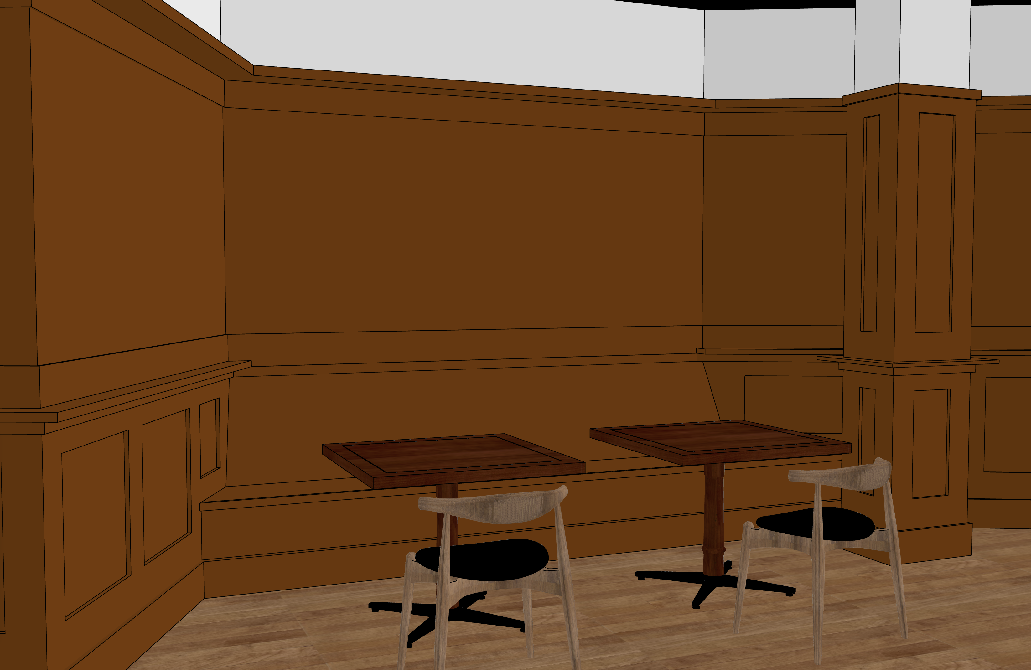 a scene inside a dark moody bar add sports memorabilia on the walls