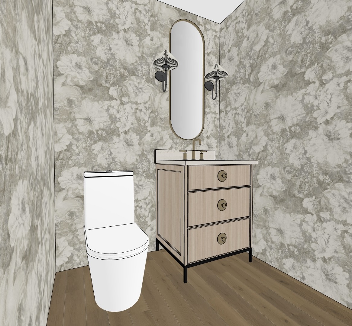ultra realistic interior powder room rendering shown from a slightly angled frontal perspective that reveals the vanity wall and adjacent side wall creating depth while maintaining a clear view of all primary fixtures all visible walls are fully wrapped in a soft muted floral wallpaper featuring large scale botanical motifs with a painterly appearance the color palette consists of layered warm gray beige and off white tones evenly distributed across all walls creating a cohesive immersive envelope consistent with a classic yet refined aesthetic on the left side of the room a modern one piece white toilet with smooth rounded contours and a closed lid is positioned against the wallpapered wall clean and minimal in design on the right side a freestanding vanity is placed slightly forward from the corner the vanity features three vertically stacked drawers and is finished in a light natural oak wood tone matching the exact same wood finish used throughout the harris project the wood shows subtle natural grain variation with a matte low sheen finish reading warm and refined not yellow not gray and not rustic the vanity sits on slender black metal legs lifting it slightly off the floor each drawer is fitted with a centered circular brass pull adding a subtle decorative accent while maintaining symmetry the vanity is topped with a light off white solid surface countertop smooth and matte with minimal visible veining a rectangular integrated sink is centered in the countertop and paired with a brushed brass widespread faucet with clean traditional lines above the vanity a tall vertical oval mirror with softly rounded ends is mounted centrally the mirror features a thin brass frame adding warmth and continuity with the faucet and hardware flanking the mirror symmetrically two wall mounted sconces are installed at equal height each sconce features a black metal base and arm paired with a light colored pleated shade softly diffusing light the shades are clearly light in tone off white ivory matching exactly the appearance shown in the image and maintaining a refined vintage inspired look the floor is finished in medium tone natural wood planks laid lengthwise with visible grain that complements the light oak vanity and balances the wallpaper pattern lighting throughout the powder room is soft even and warm with the sconces providing gentle illumination and no harsh shadows the overall aesthetic reflects a sketchup style architectural 3d render characterized by clean outlines simplified geometry crisp edges and flat yet realistic materials maintaining accurate proportions and a calm uncluttered composition no elements are added or altered the scene remains fully faithful to the original image and perfectly consistent with the previous powder room view