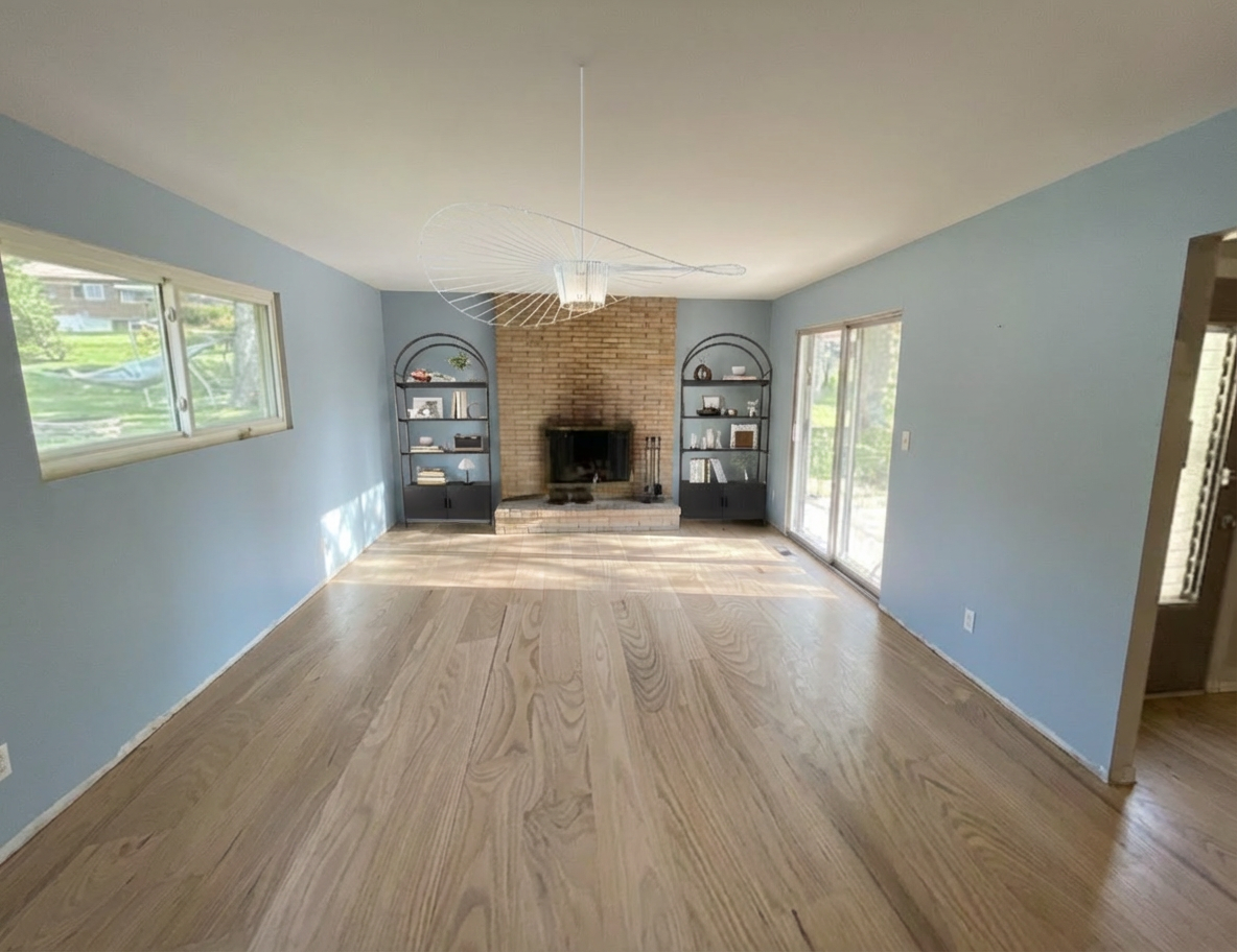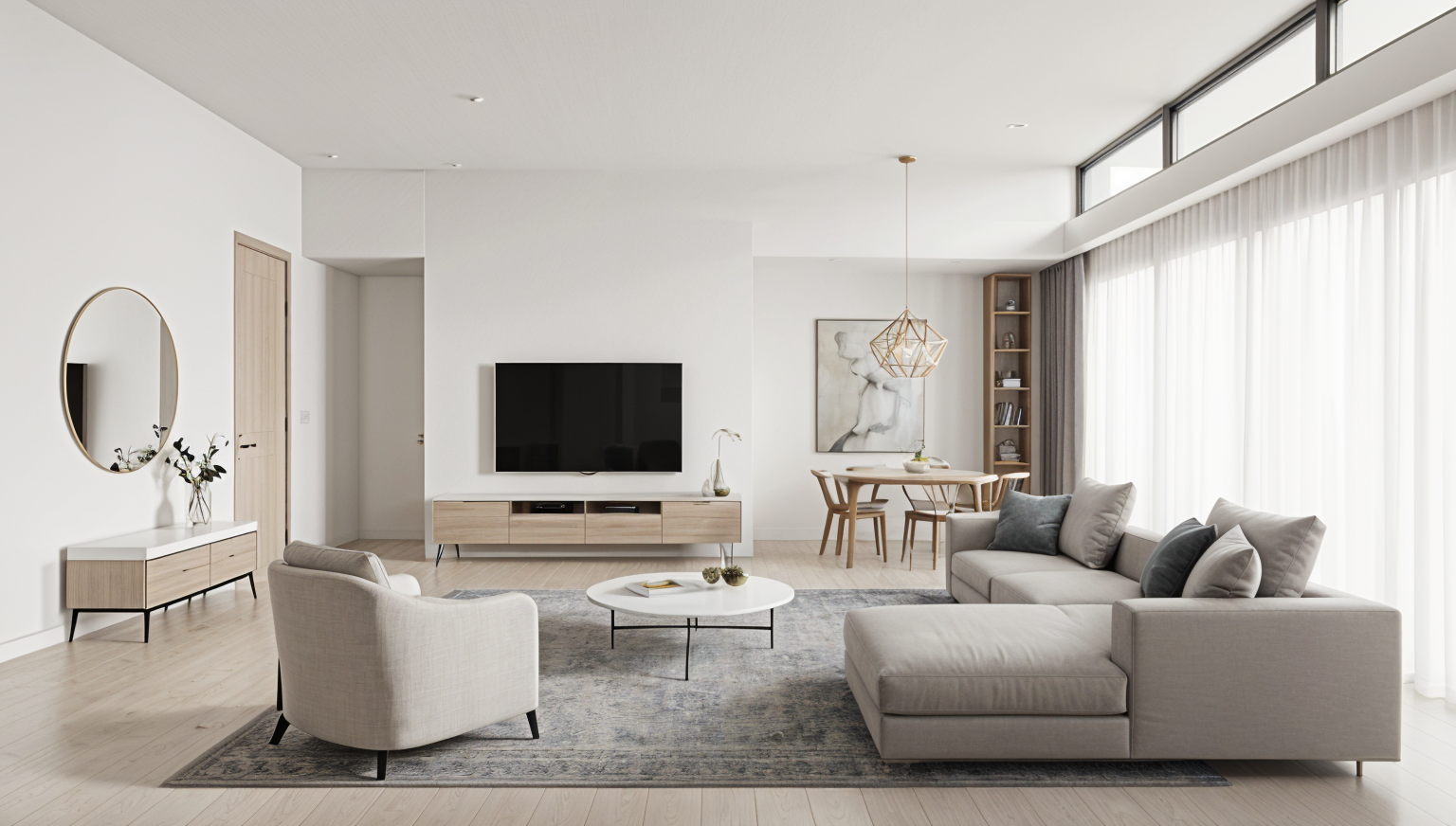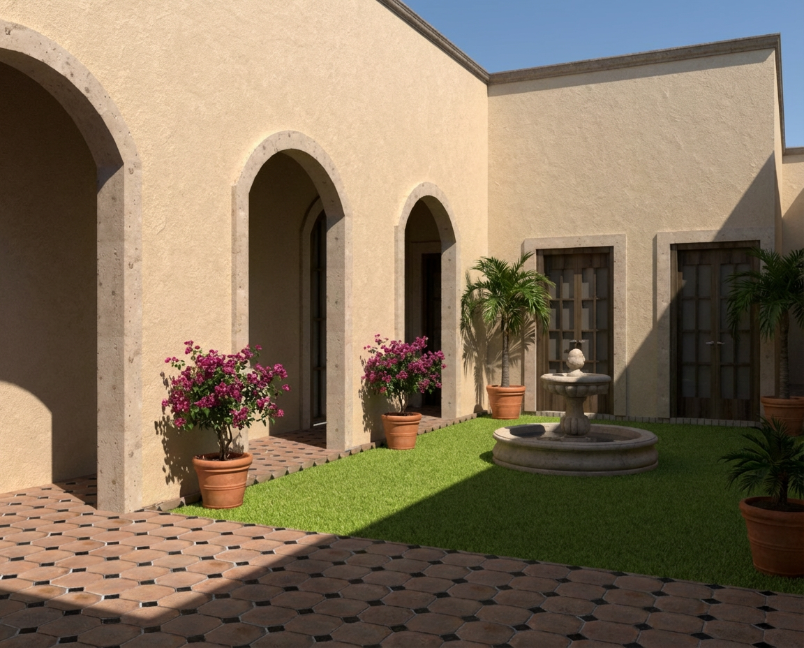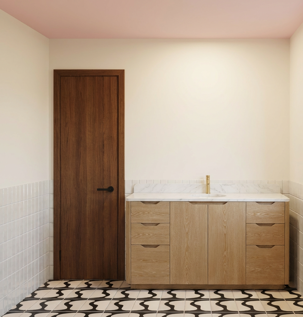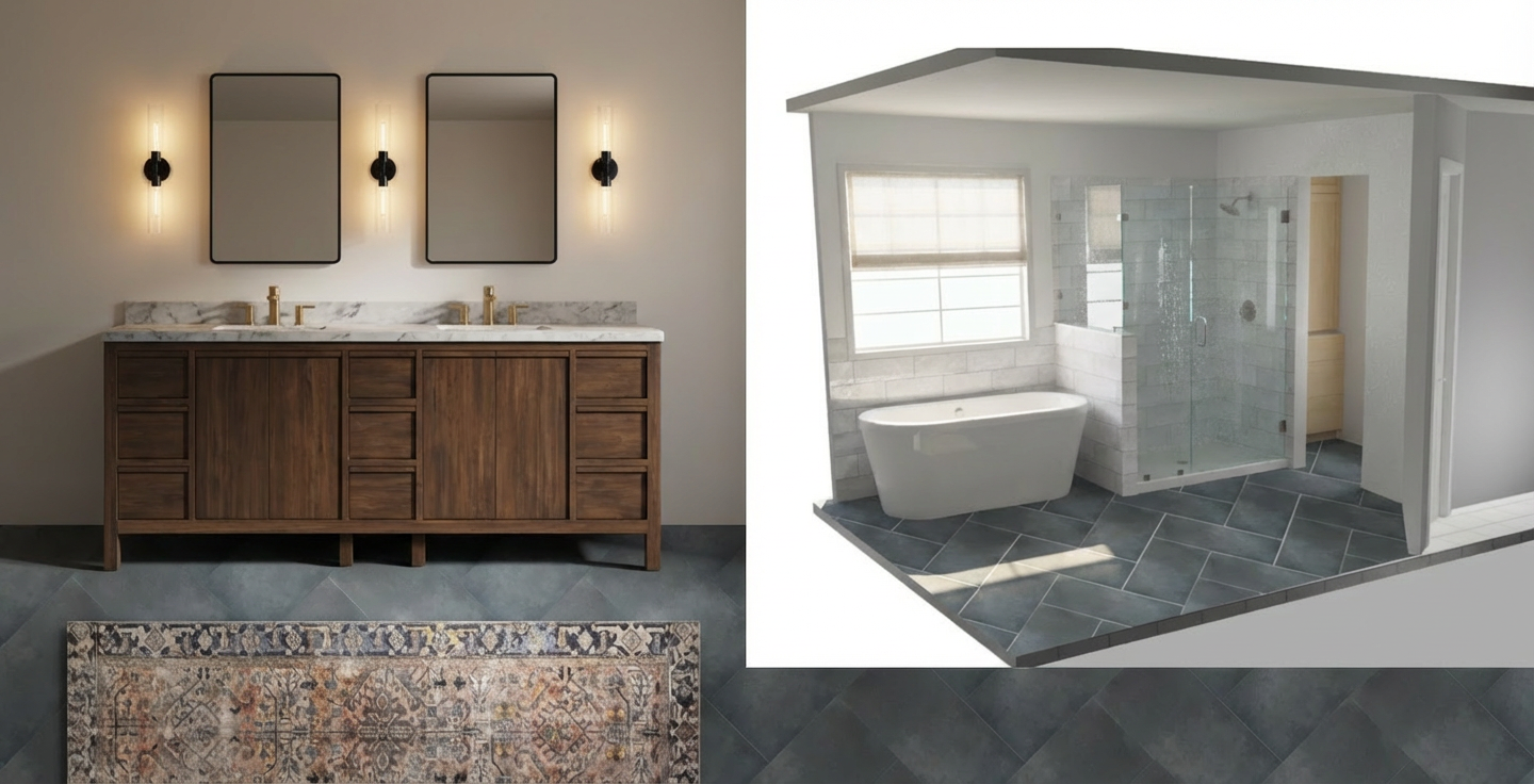 photorealistic soft even ambient lighting from the two lit sconces creating realistic but clean architectural shadows high key overall illumination with gentle gradients to define depth and material texture professional clean minimalist elevation style large terrazzo tile flooring solid wood cabinetry in medium dark wood tone with visible straight grain and matte finish use dense cross hatching and darker tonal values for wood texture left side has two stacked drawers over one deeper drawer central double cabinet doors right side has one wide drawer over two smaller stacked drawers all hardware is sleek horizontal brass pulls above the vanity two identical wall sconces each with a brass gold bracket and spherical white opal glass globe shade turned on with soft glowing light large arched top mirror with thin polished brass frame full height backsplash wall behind everything vertically oriented rectangular ceramic tiles approximately 4x12 proportion laid in a perfect grid with crisp white grout lines tiles rendered in light to medium gray green with subtle texture shading to show the vertical orientation and slight sheen thick white marble or quartz slab with very subtle veining polished surface bright white with soft gray shadows underneath the overhang rectangular undermount sink white porcelain sink centered on the countertop modern faucet brass wall mounted or deck mounted gooseneck faucet with two separate handles shown in bright metallic tone