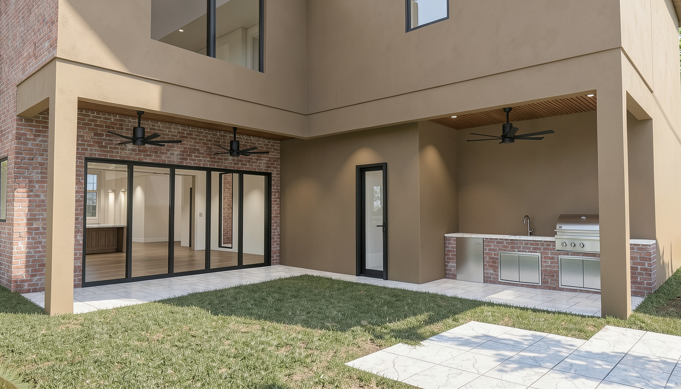 convert this backyard porch and outdoor kitchen architectural rendering into a highly realistic crisp editorial style architectural photograph suitable for a luxury real estate listing maintain the exact architecture layout proportions materials appliance placement and design shown in the rendering do not redesign restyle reinterpret or modify anything no creative additions only enhance realism lighting and material detail do not add any prompts text labels graphics furniture decor or overlays do not modify the landscape design only enhance realism very important do not add any hardscape elements this includes but is not limited to no stone paths no pavers no patios no gravel no stepping stones no mulch beds no retaining walls no decorative rock the landscaping should remain soft landscape only consistent with the rendering only grass and simple planted greenery may appear do not introduce new landscape features material details already existing in the rendering should appear highly realistic exterior brick is old texas brick tiffany red maintain the exact color and brick layout while enhancing realism with subtle color variation between bricks natural mortar depth and realistic exterior shadowing secondary walls are smooth stucco painted sherwin williams urbane bronze the stucco should appear smooth and refined with subtle natural light reflection and soft surface texture consistent with high end exterior stucco flooring is tilebar shala white french pattern outdoor tile maintain the exact pattern layout and color while enhancing realism with natural stone texture subtle tonal variation between pieces accurate grout joints and a matte exterior finish the outdoor kitchen includes bull outlaw 30 stainless steel grill two stainless steel access door panels one under the grill and one under the sink stainless steel sink faucet stainless steel outdoor beverage refrigerator maintain their exact placement and proportions while enhancing realism through accurate brushed stainless steel texture and natural reflections the porch ceiling includes fluted wood paneling and matte black ceiling fans maintain their exact appearance while enhancing natural wood grain detail and subtle light reflection lighting should resemble luxury editorial architectural exterior photography natural daylight with soft directional sunlight balanced exposure between shaded porch areas and open backyard light realistic shadow depth under the covered porch natural reflections on stainless steel and stone surfaces crisp highlights with natural contrast camera style should resemble professional real estate architectural photography full frame camera perspective approximately 28 35mm lens straight vertical architectural lines sharp material clarity natural color balance high dynamic range exposure appropriate for listing photography do not alter the architecture materials layout appliances or finishes in any way the final result should appear as a high end photorealistic luxury backyard and outdoor kitchen photograph suitable for premium real estate marketing