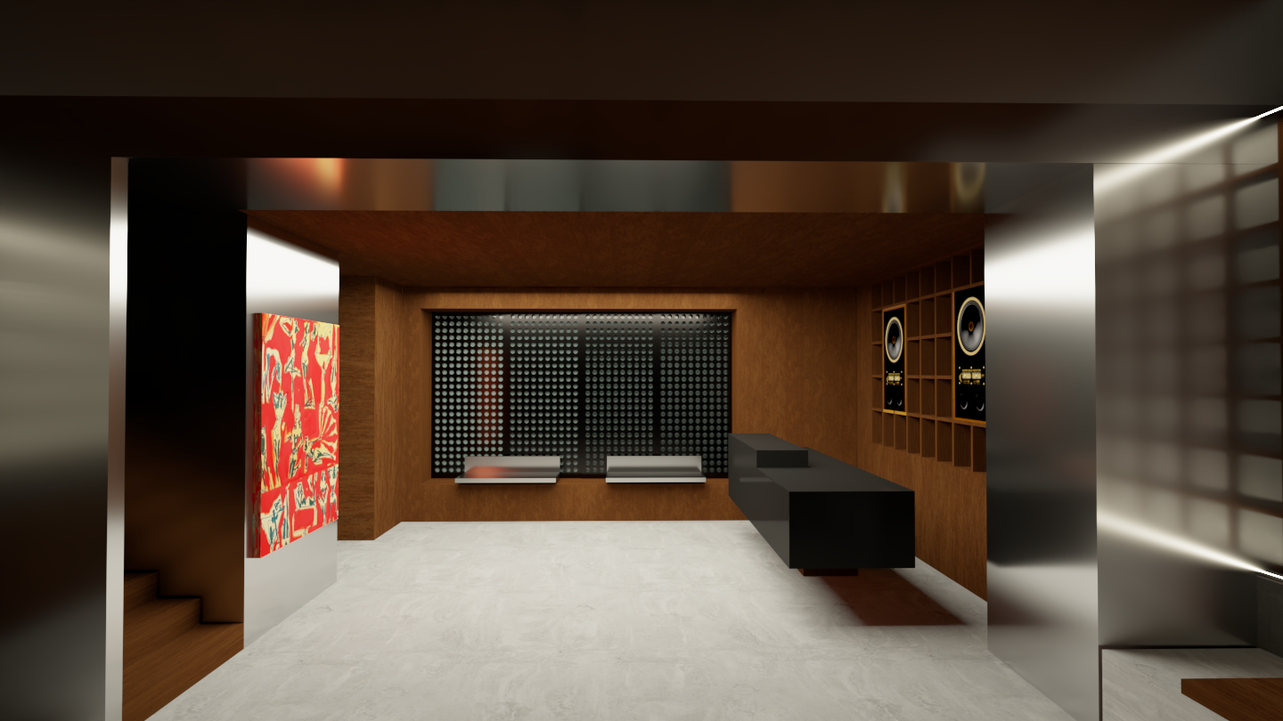 enhance the realism of the bar interior photo improve the fine details visible through the cut out holes in the backrests of the chairs making the background textures and depth more natural and physically accurate add subtle environmental depth behind the openings with realistic shadow gradients and soft focus where appropriate introduce a faint diagonal light beam entering the space from behind the chairs the light should feel natural and cinematic with gentle diffusion and realistic interaction with surfaces wood fabric metal maintain overall color balance and avoid overexposure preserve the original atmosphere of the bar while increasing depth realism and lighting coherence high detail photorealistic natural shadows global illumination make less fogged the lights on the right and make the reflection on the stainless steel in the right more realistic show only the freed reflection without the circles reflection