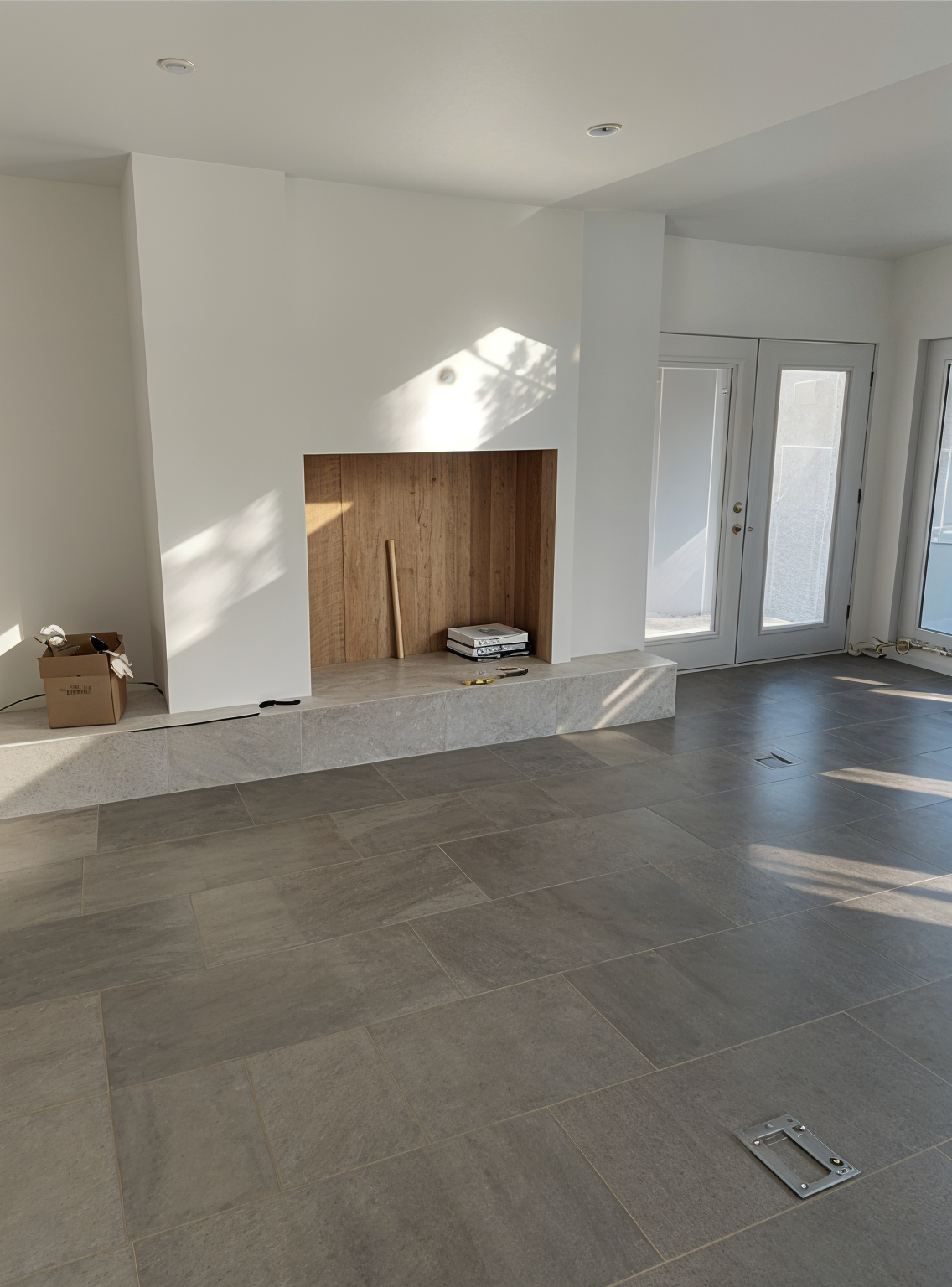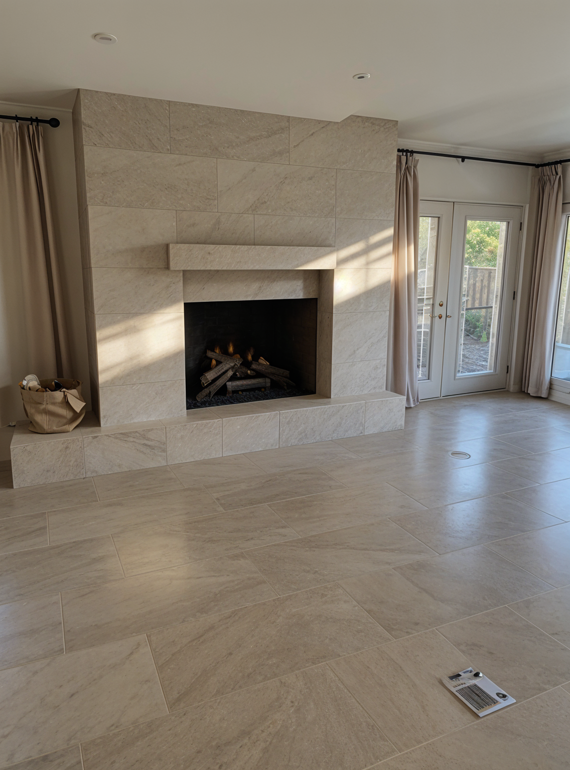 beige limestone floor add fireplace limestone on walls add curtains beige add modern furniture in forefront