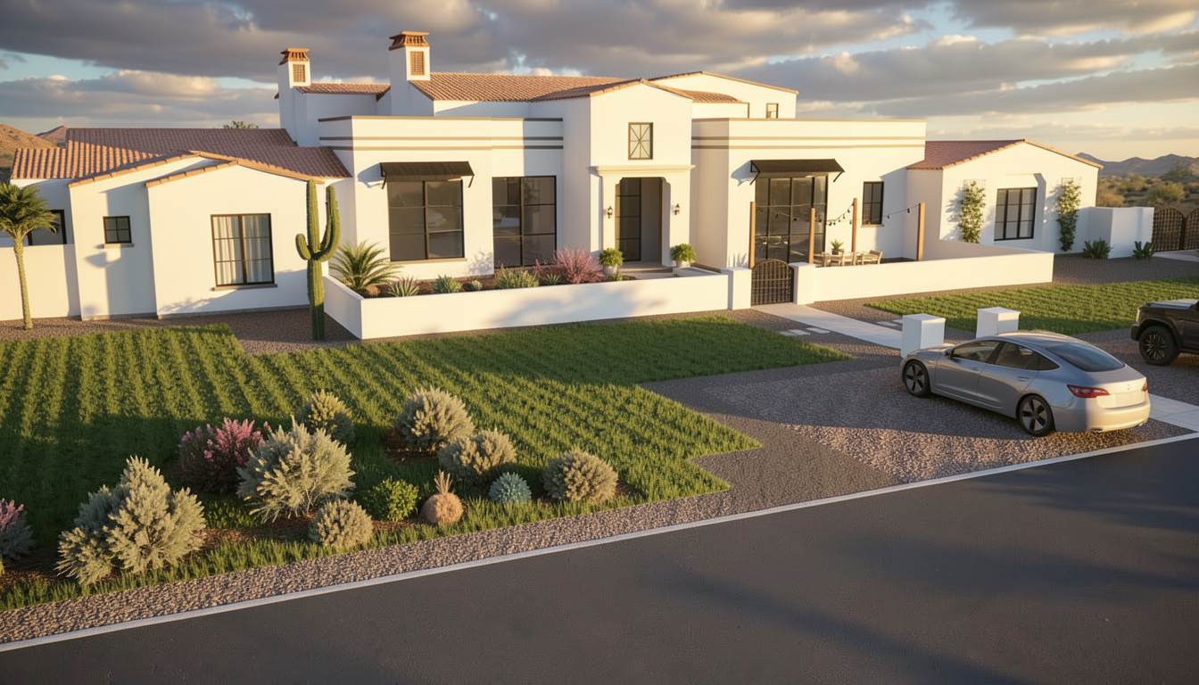 this house is in phoenix arizona i want a photo realistic rendering at 3 pm in the afternoon with partly cloudy skies add vegetation in gravel areas around the green lawn