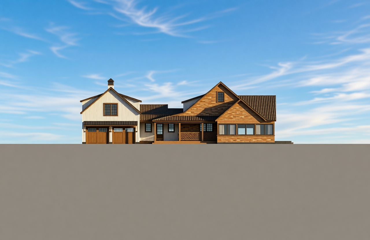 cedar shingle siding old vertical barn board siding at garage fieldstone veneer under covered porch black asphalt shingle roof circular paved driveway