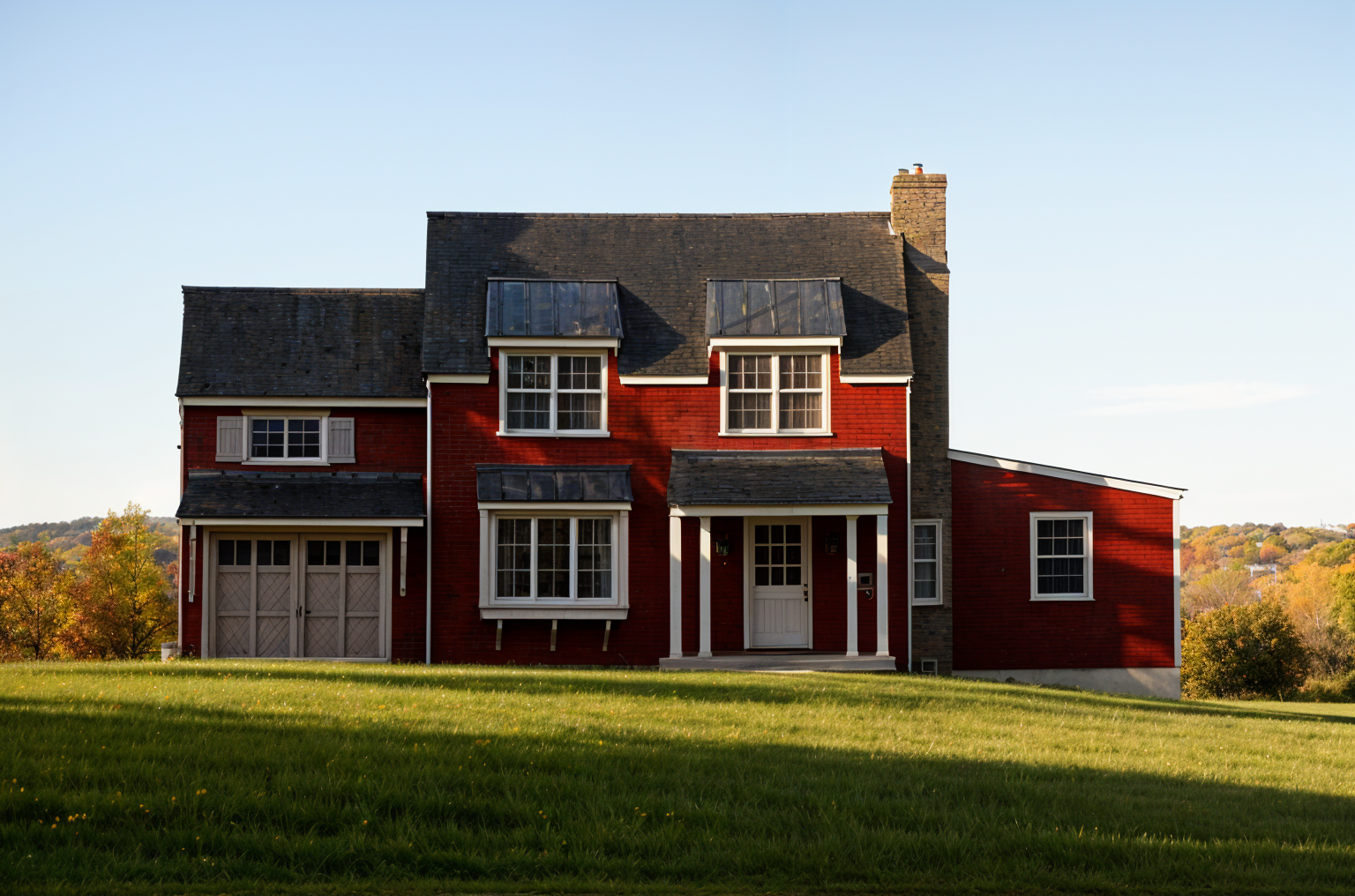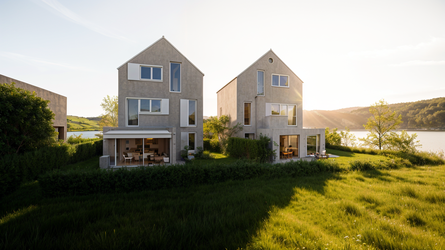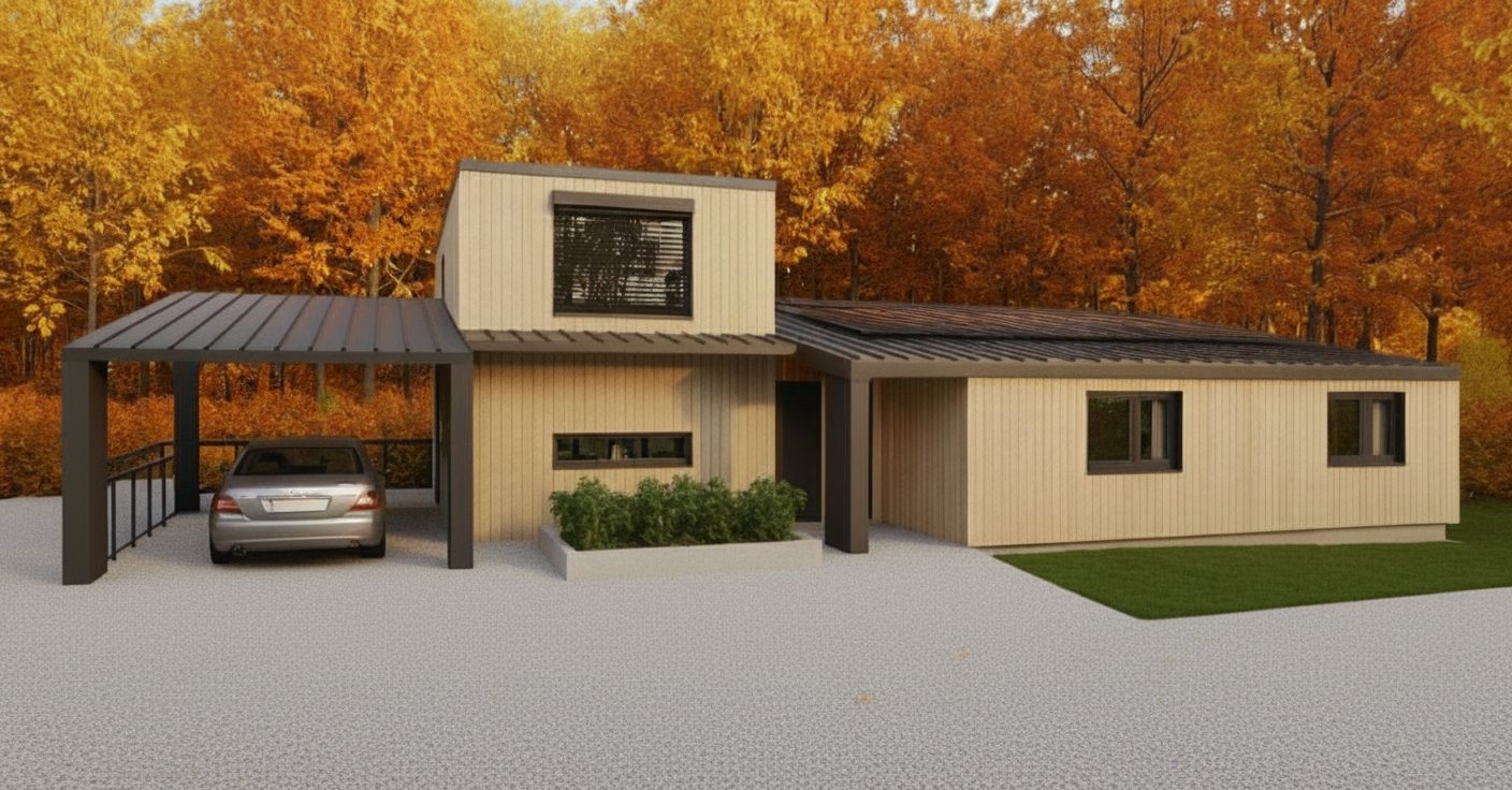 exterior shot modern minimalist house with a flat roof and solar panels situated on a green grass landscape the house is painted in shades of light beige and soft gray with large windows framed in white the driveway is a smooth dark gray leading to a sleek carport a light serene atmosphere with soft natural lighting highlighting the clean lines and modern design render with high detail and a realistic texture for the walls and roof capturing the subtle sheen of the solar panels