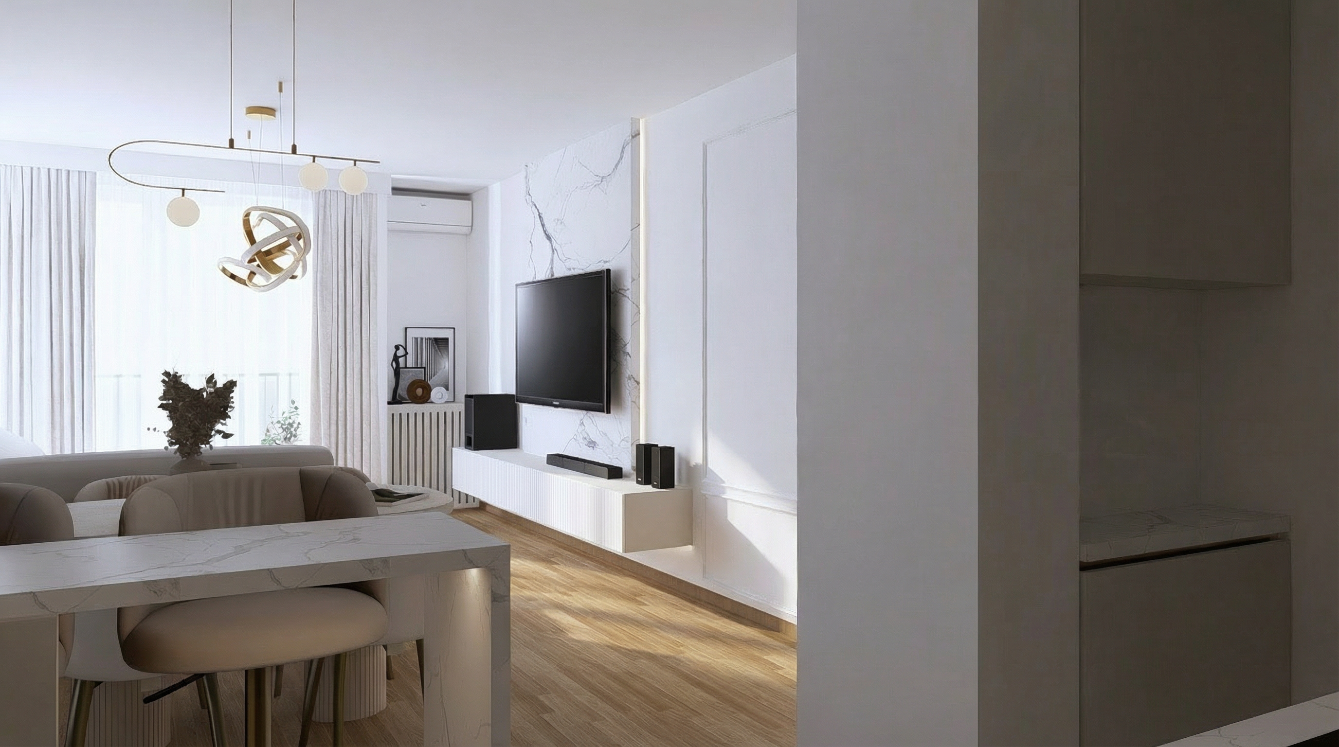 transform this rendering into an ultra photorealistic architectural photograph shot in bright summer atmospheric light preserving the exact geometry materials colors and composition from the original image enhance only real world material behavior natural reflections roughness variation subtle imperfections apply physically accurate daylight soft shadows realistic global illumination professional architectural photography look with a 35 50 mm lens straight verticals natural exposure no cgi look indistinguishable from a real photo correct slight errors in the rendering and display the clinker textures seamlessly the white facade consists of white painted clinker background on the right with trees bottom left foreground with pavement realistic glass through which interior space can be seen slightly add gutters and downpipes made of zinc discreetly lighting from the viewer s perspective not from the right downpipes only in inner corners
