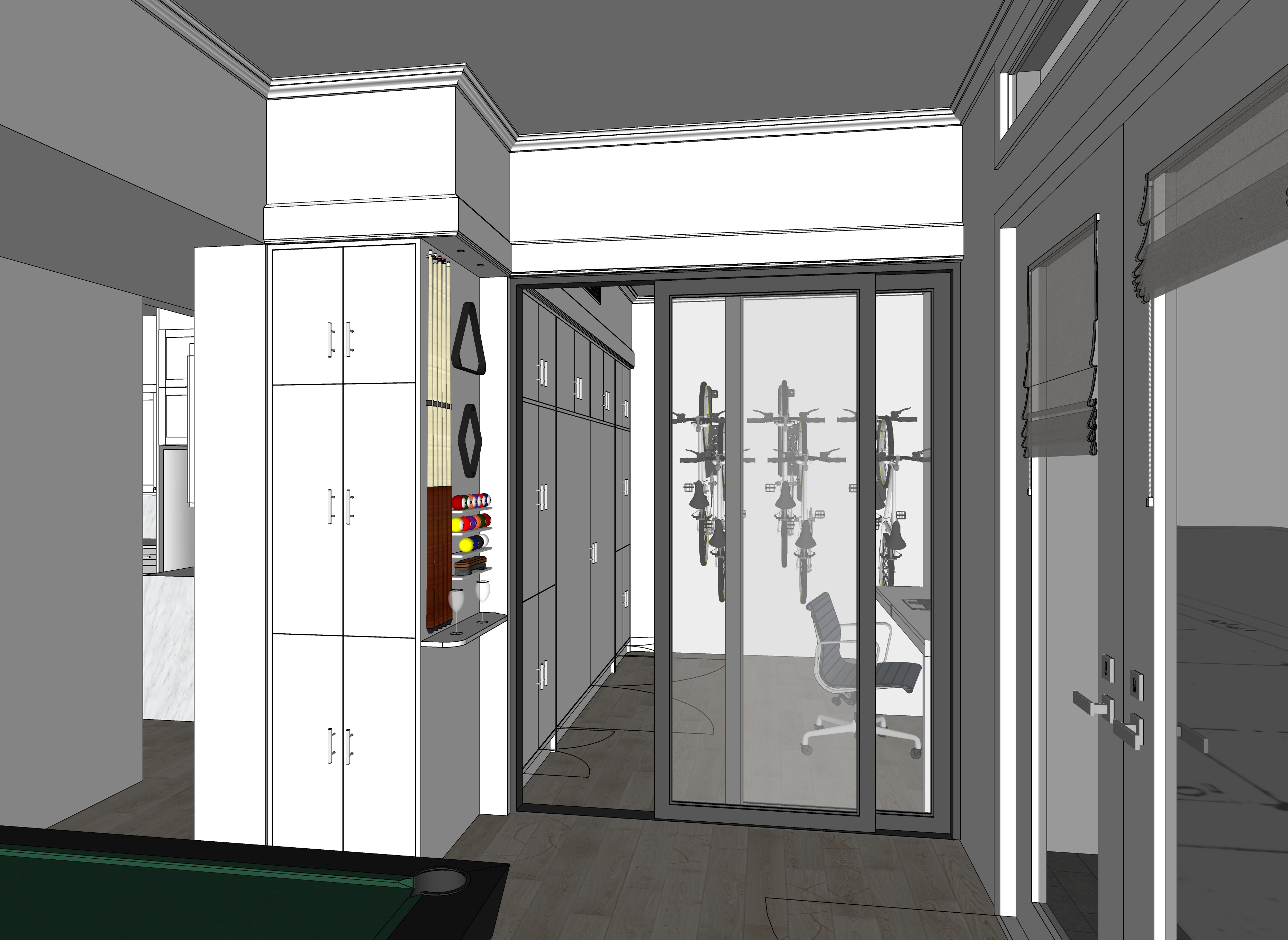 add lighting on the white marble countertops keep the cabinets white like the source image the walls are painted white keep the light effect over the pool table add a man sitting at the desk working at the laptop do not add any recessed lights to the view don t add any pendant lights over the desk make the light color temperature warmer keep the ceiling white and all of the walls painted white