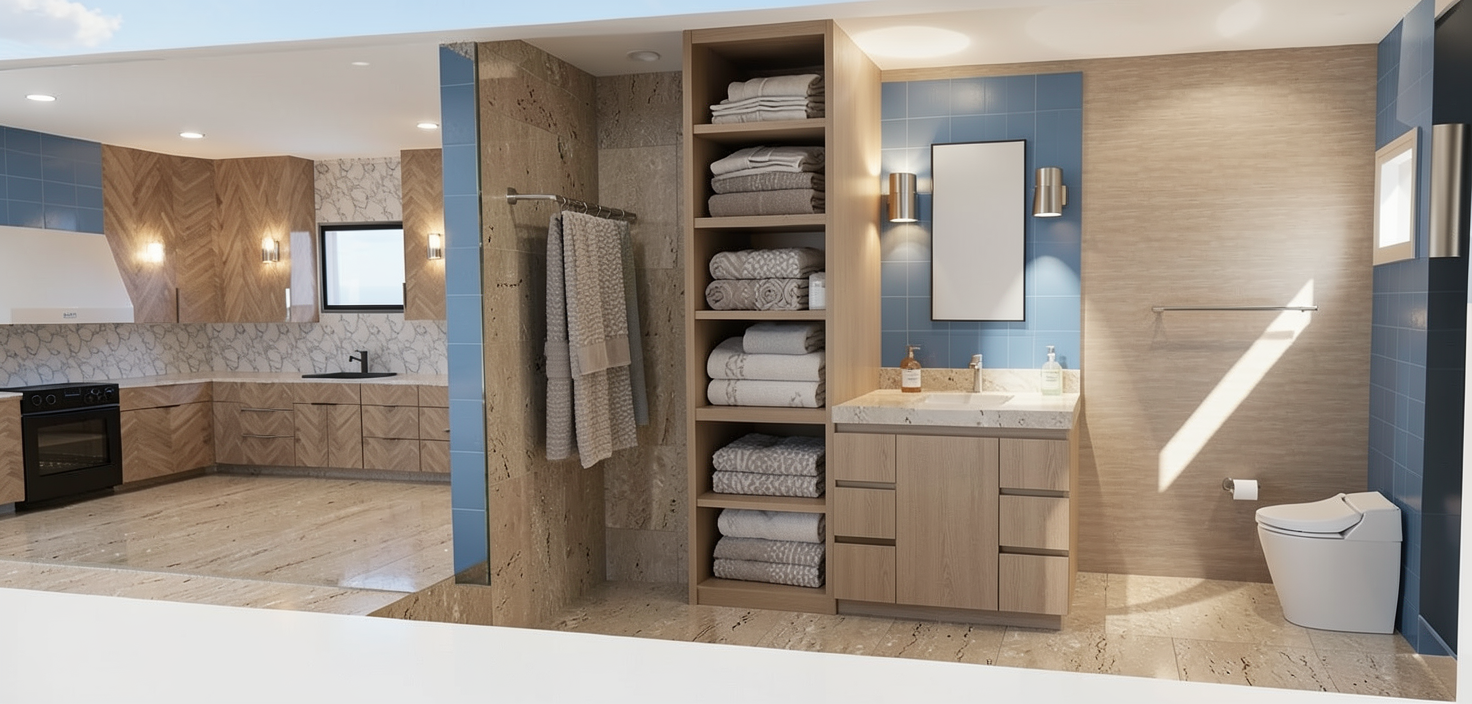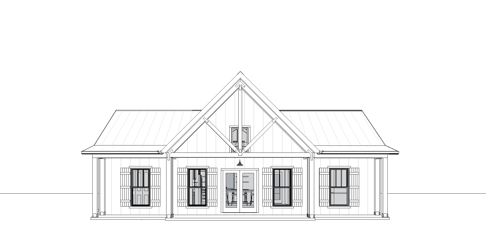 create a scene where the roof and the house are clad in black standing seam metal the windows are black the porch columns and framing are stained walnut add a winding flagstone sidewalk from the front porch the land is wooded with a lake in the background the window shutters and trim are stained walnut the front porch is concrete the siding is black standing seam metal
