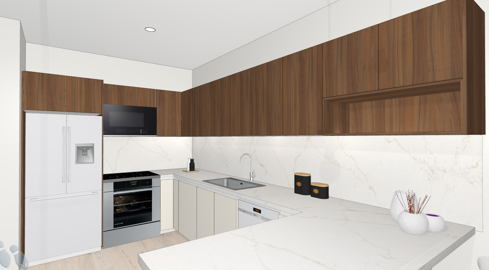 elegant kitchen dark walnut mat wall units and magnolia gloss fridge white
