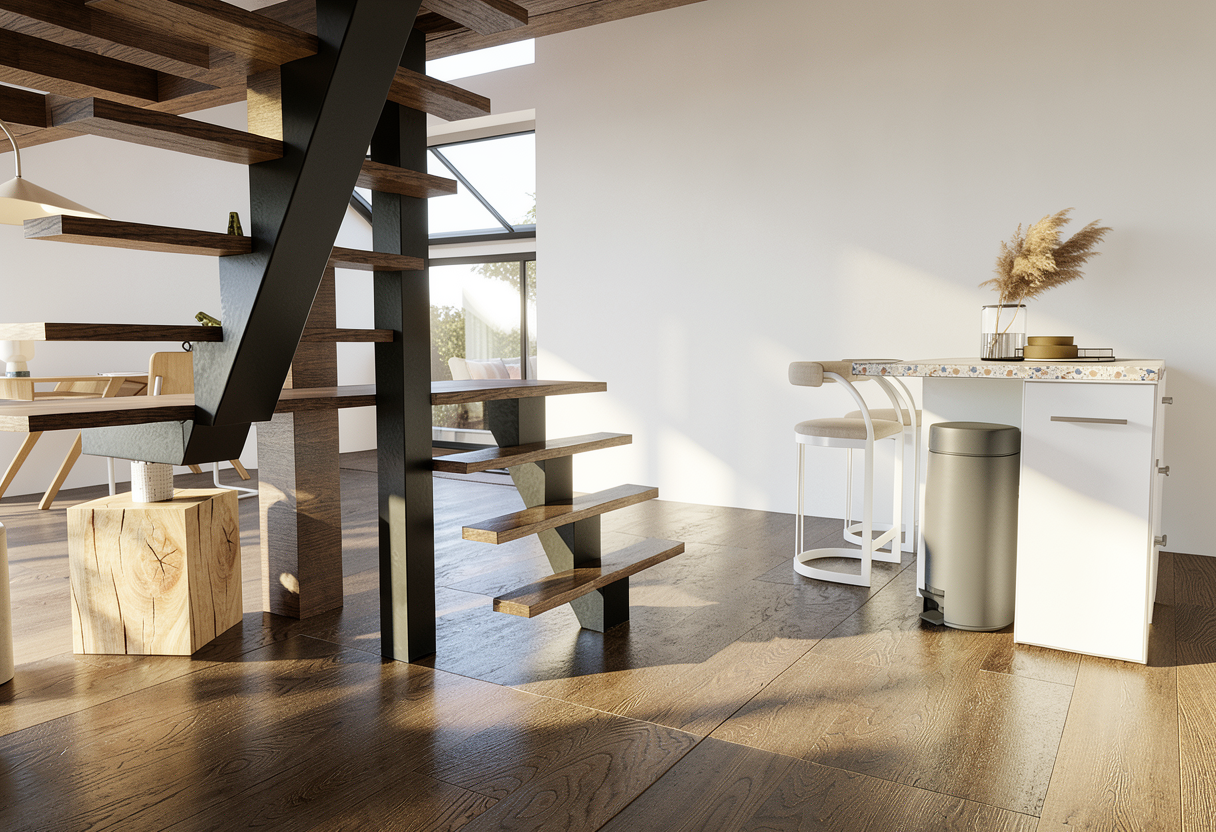 photorealisitc architectural render keep the same material keep the same color keep the same global illumination turn on light fixtures replace plant with realistic plant from the same type small plant do not change original colors add natural light do not add more plant