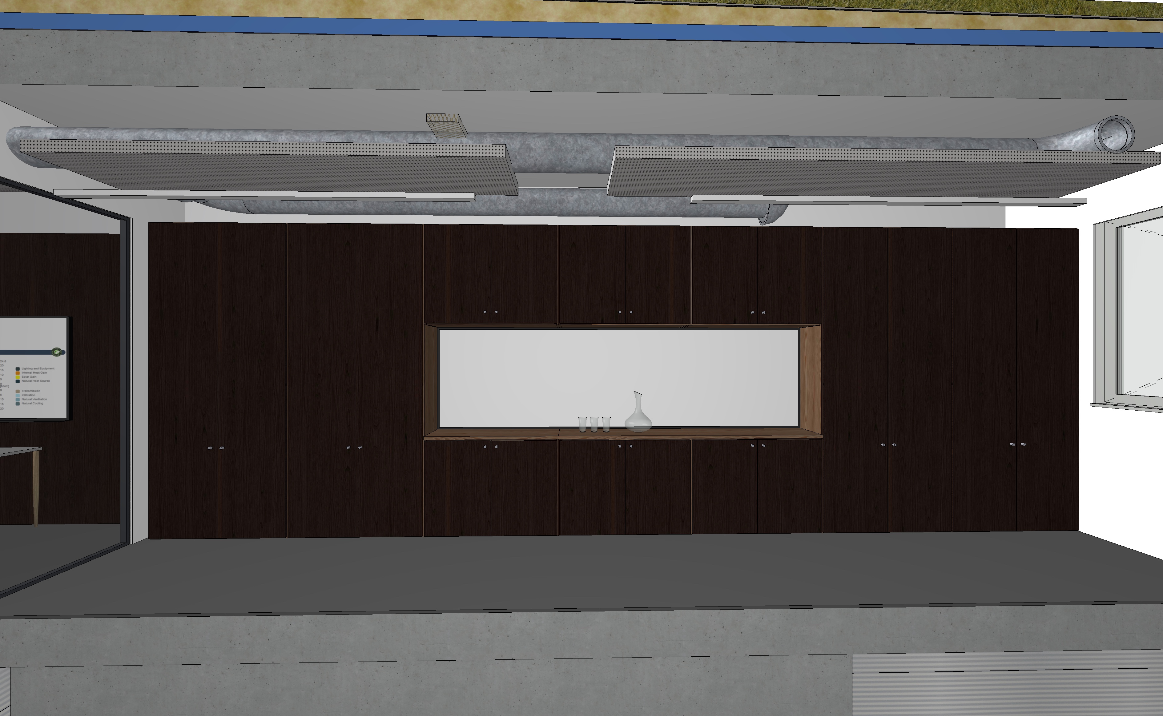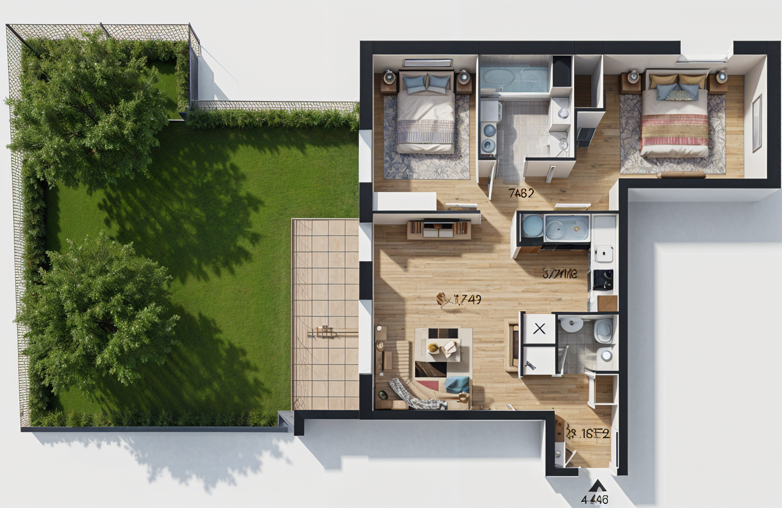 enhance this image to make it highly photorealistic while keeping exactly the same original color palette and composition replace all surfaces with realistic materials and detailed textures furniture realistic wood with natural grain and a clean finish floor matte dark gray epoxy resin floor center area a soft rug or carpet in the middle with realistic fabric texture use clean bright even lighting to make the scene slightly more illuminated and professional avoid strong or visible shadows the result should look clean modern and highly realistic with detailed materials and textures and a professional interior design appearance do not change the original colors or layout