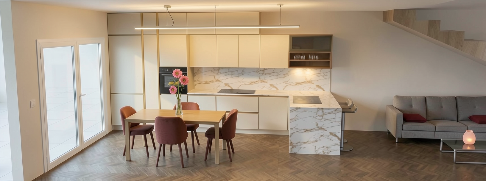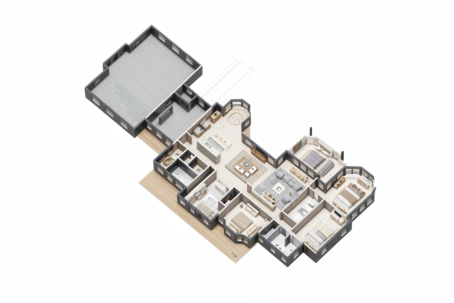 make as photorealistic as possible while keeping textures the same as shown professional landscaping in a lightly wooded suburban scene in greensboro nc around 1pm remove any text siding 485559 corner trim 485559 window trim e8e8e4 soffit and fascia is white bessemer grey brick windows white moire black certainteed roof pine unfinished posts and rails