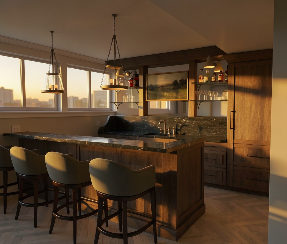 a terra abbiamo un pavimento in linoleum beige chiaro vetro cannettato riflettente non ci sono strip led come illuminazione come illuminazione abbiamo dei binari con faretti a luce calda la struttura del biliardo e il fondale delle stecche in legno laccato nero il bordo superiore del biliardo e la cornice perimetrale delle stecche in legno rovere chiaro a destra del biliardo abbiamo una tenda di colore rosso rame a destra delle stecche abbiamo una tenda di colore solo verde scuro fai entrare un p di luce naturale metti 1 2 zaini e borsa a terra con libri