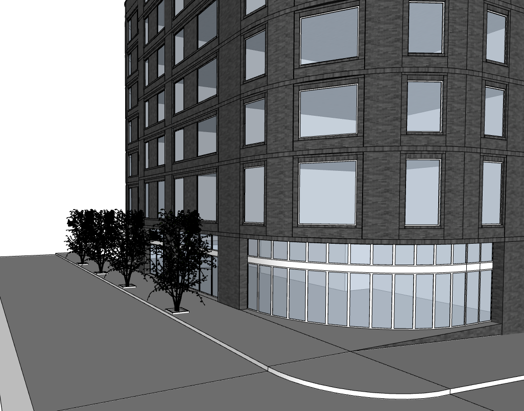 produce rendering of a warm gray brick building with contemporary brick detailing all lintels and sills should be a solider course warm gray brick windows should be black color industrial style provide curtain wall glazing at the ground level where the building curves populate scene with people cars lighting trees