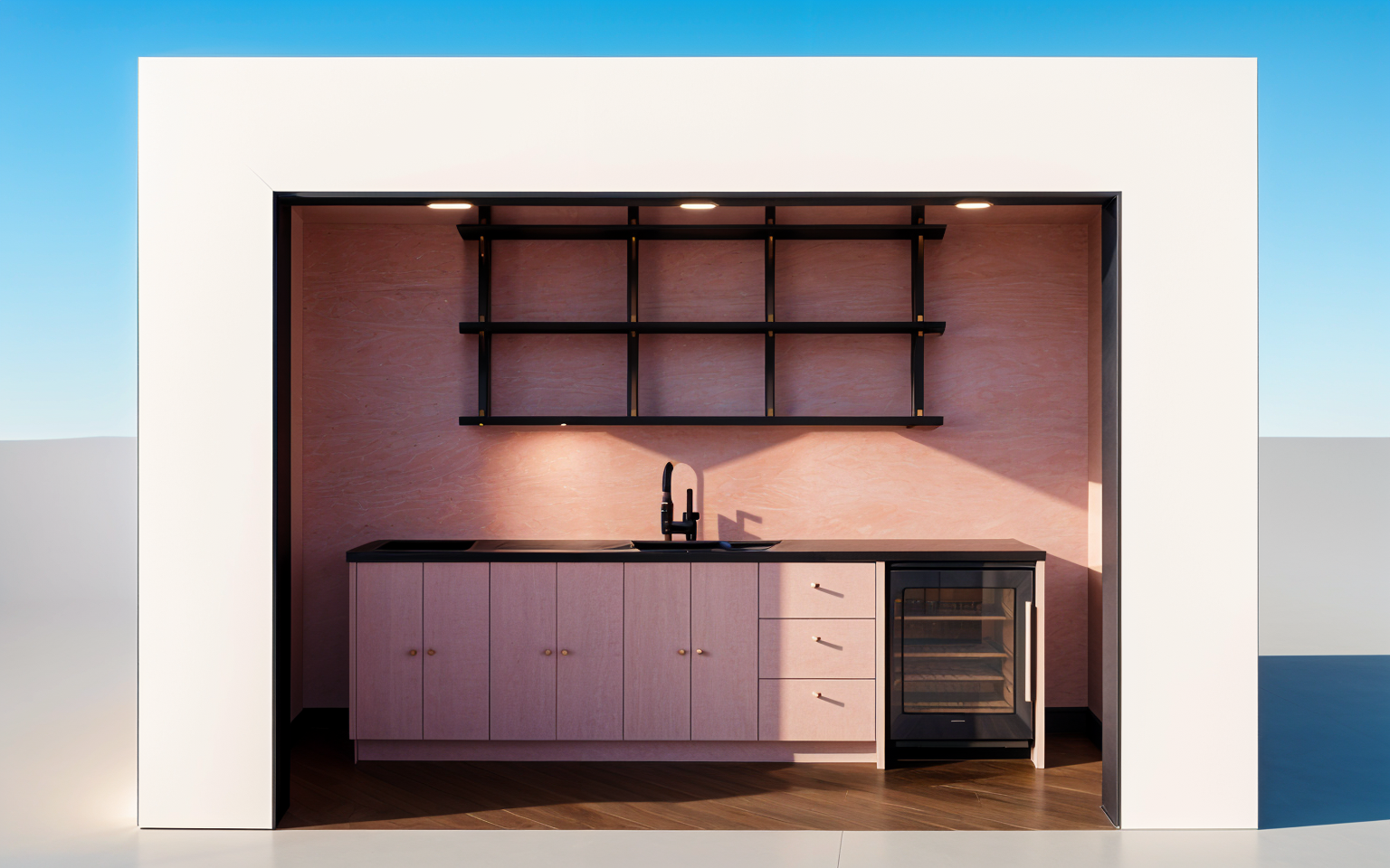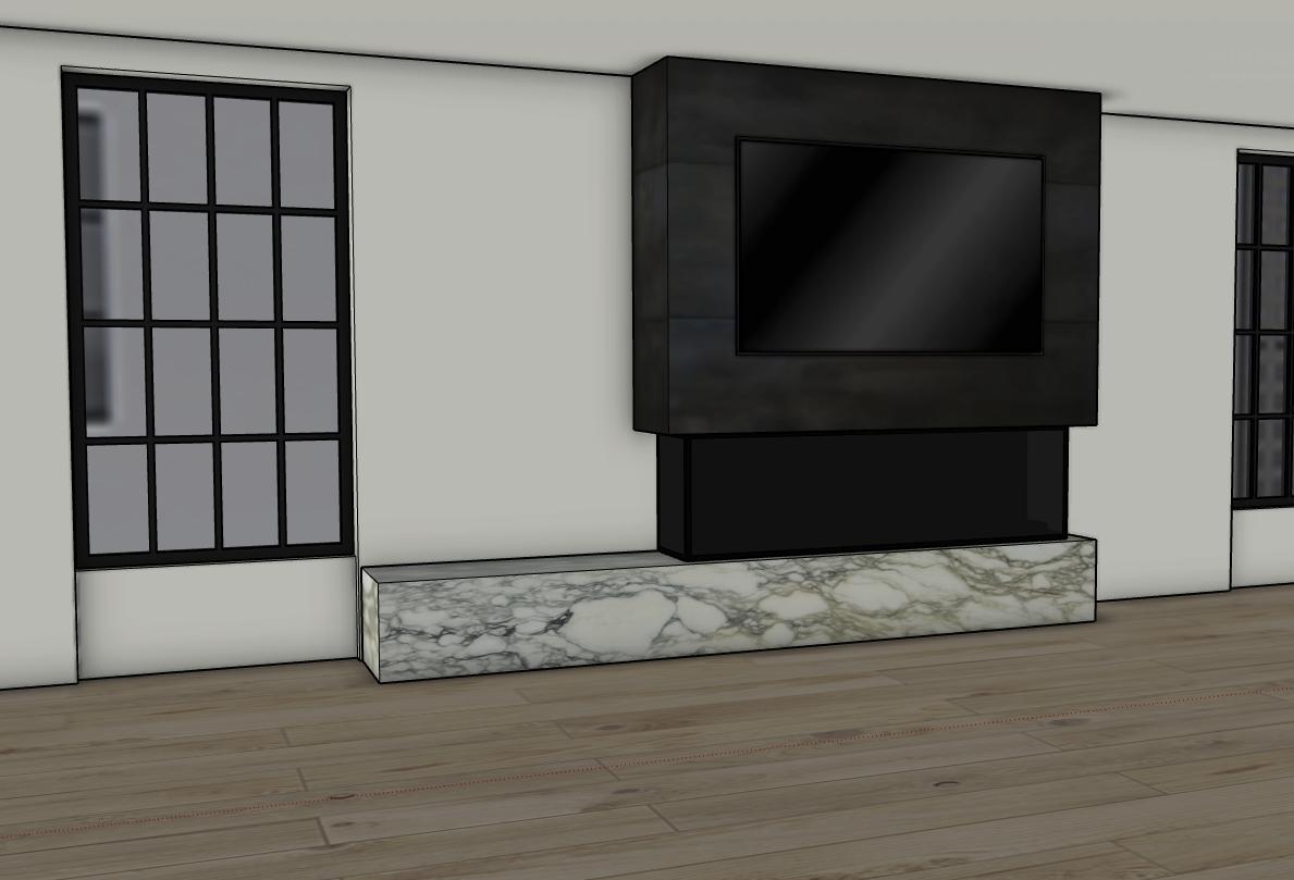 ultra photorealistic 4k rendering of the provided fireplace design preserve exact geometry proportions layout and camera angle the fireplace hood is darkened blackened steel with a matte to low sheen finish it should have subtle tonal variation natural patina and visible welded seams include faint horizontal and vertical weld lines and slight panel variation so it reads as fabricated steel not a flat material the tv is fully recessed into the steel hood with a very tight clean reveal the gap between the tv and steel should be minimal and precise the screen should be off with a soft realistic reflective surface not a glowing display the firebox opening below should be deep clean and dark with a subtle black glass or metal interior no visible flame unless very faint and realistic the stone hearth is a high end marble with strong veining improve realism by adding depth translucency and natural variation in the stone veining should feel organic and continuous across the surface with softened edges and slight polish reflection walls should remain clean and neutral but with subtle texture and realistic light falloff lighting should be soft natural and architectural add realistic global illumination soft shadows and gentle contrast avoid harsh or artificial lighting enhance material realism throughout wood flooring should have natural grain variation slight reflectivity and tonal shifts steel should feel heavy and slightly imperfect stone should have depth and realism maintain sharp overall image quality but avoid overly crisp or artificial edges keep a natural photographic softness do not redesign or change any elements only enhance realism materials and lighting
