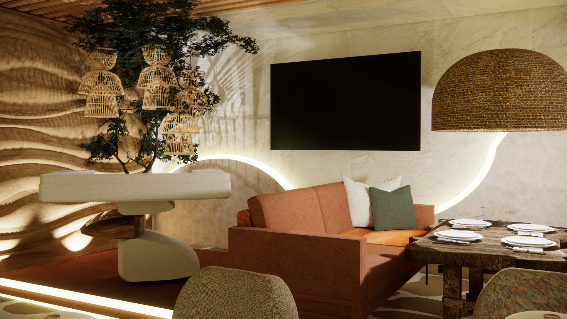 photorealistic soft warm glow lounge ambiance keeo roporttions and design tv playing music effects worgs riva lounge