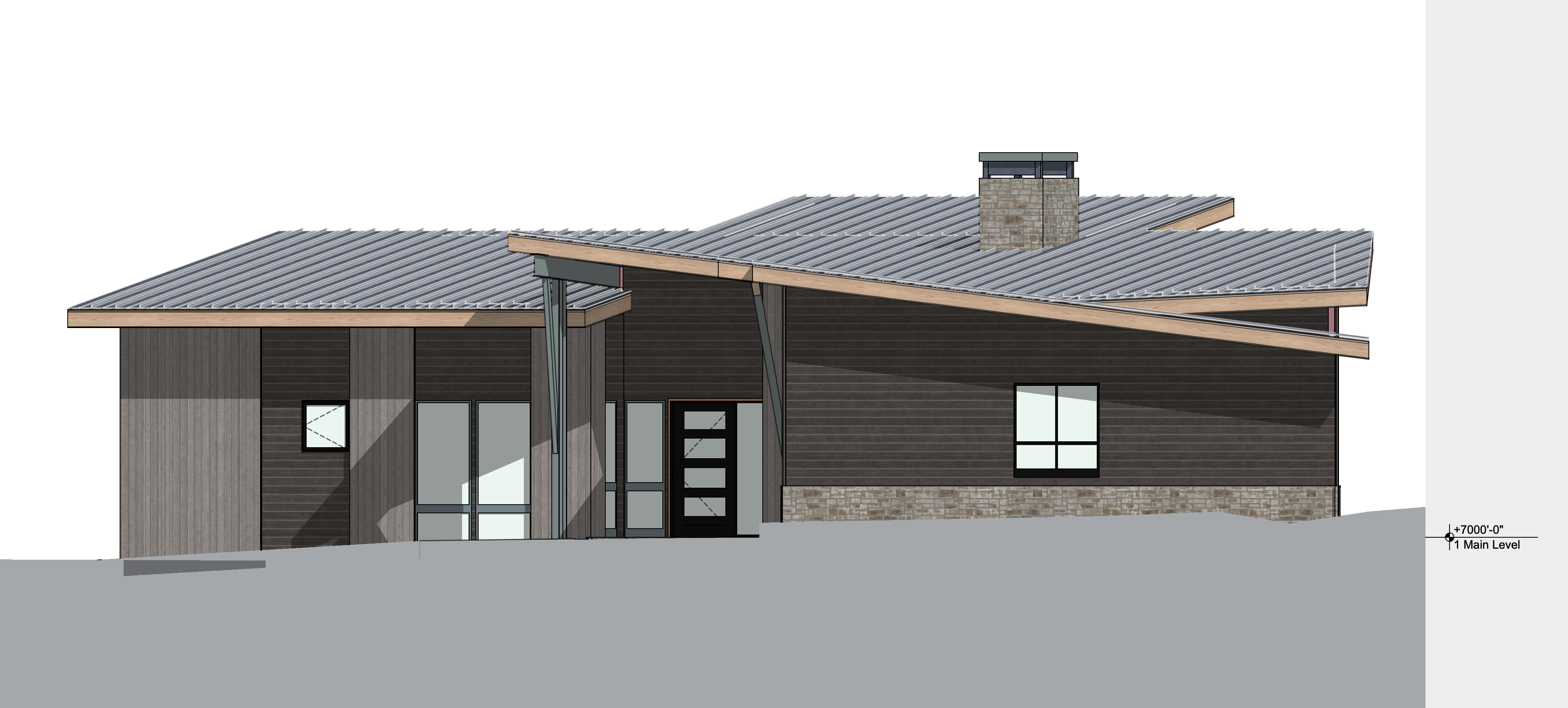 rendered elevation drawing snowy pine forest around the home and distant low mountains alpine glow from behind the camera