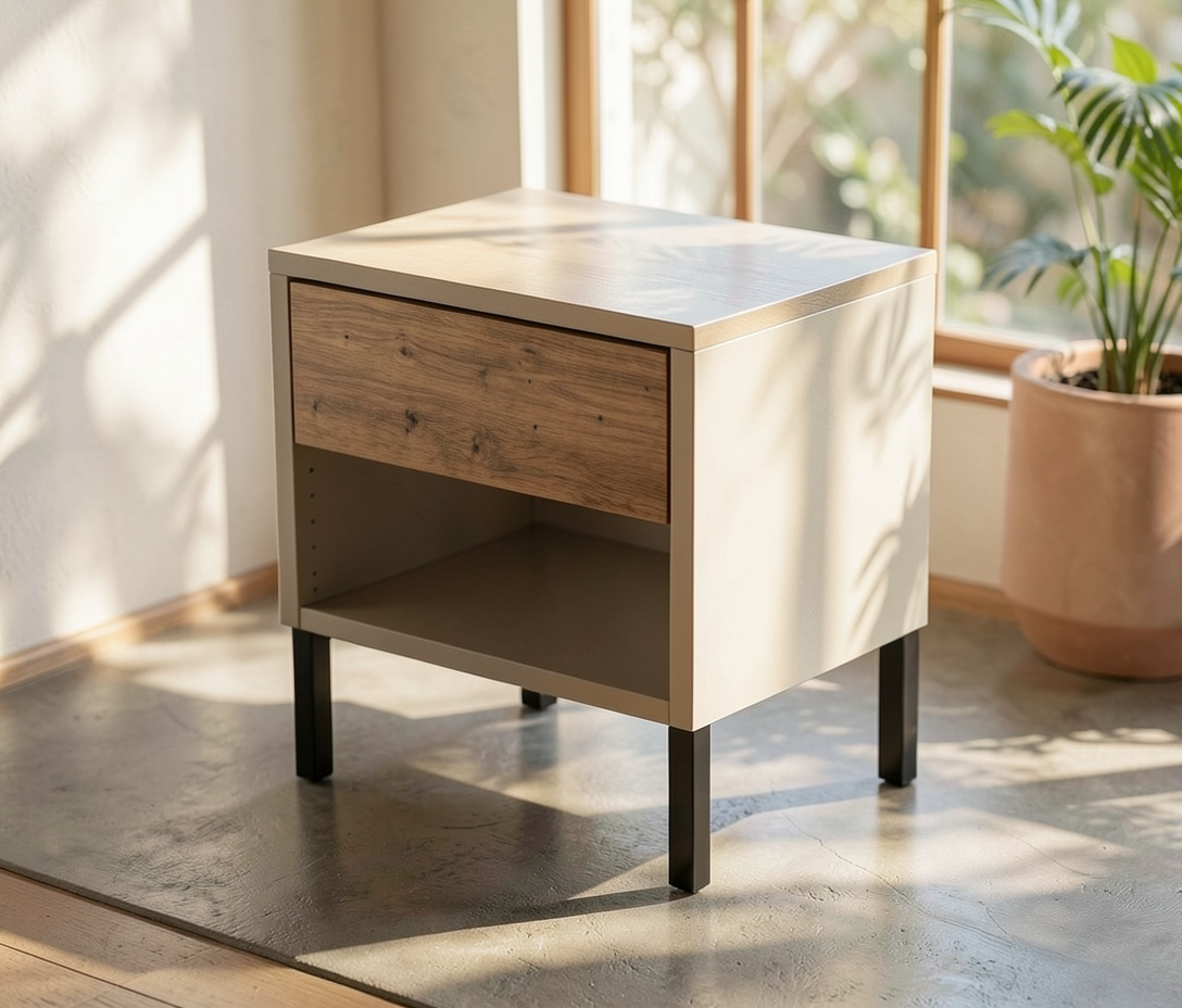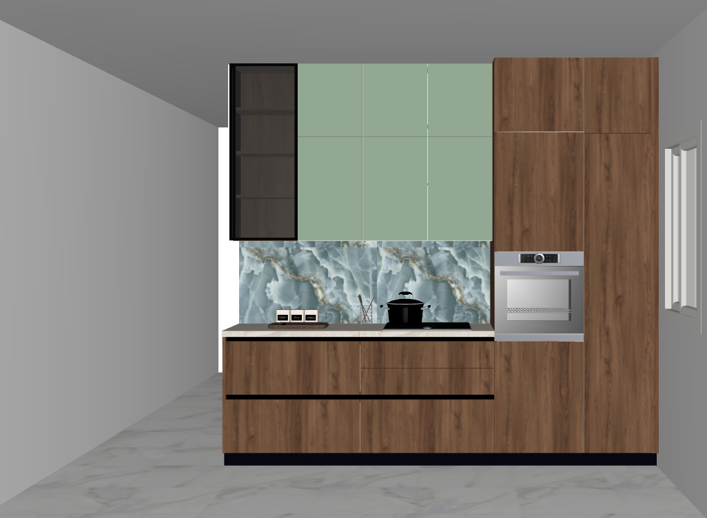 a modern kitchen with minimalist design featuring sleek beige cabinets and black handles the countertops are a rich dark wood adding warmth and contrast include a stainless steel mixer and small potted plants for a touch of greenery the tall pantry cabinet is a light oak wood enhancing the natural feel the floor is a polished light gray marble creating a luxurious atmosphere a large window with wooden blinds allows soft natural light to flood the space casting gentle shadows the walls are a subtle dove gray complementing the overall neutral palette with a calm welcoming ambiance