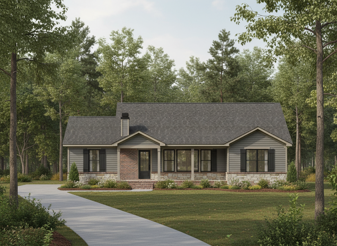 make a 3d model of a rear rendering of this home brick is country road color from the reference shutters are black from the reference windows are black from the reference shingles are charcoal from the reference gutters are black from the reference siding is iron ore from the reference trim is morris grey from the reference