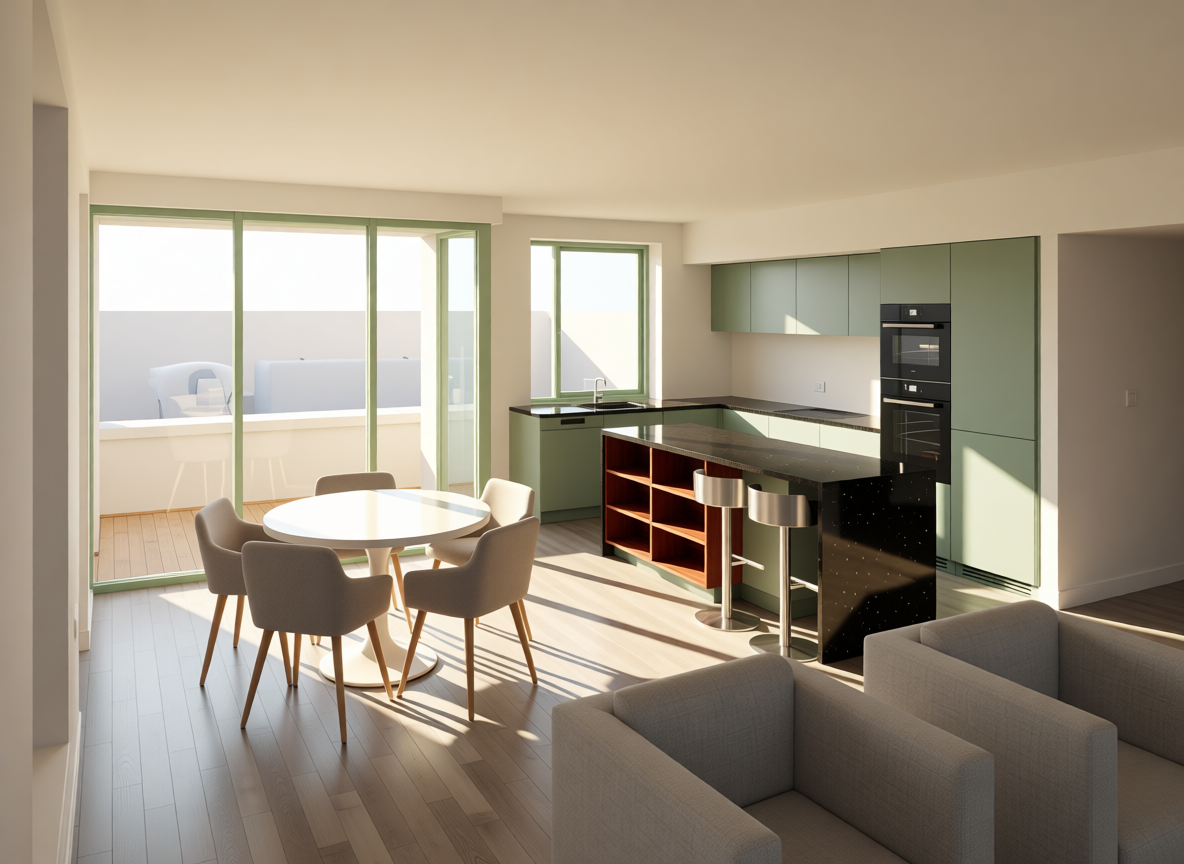 three central office buildings with their windows cleared of reflections or outside views while the interiors still appear as functional office spaces interior lighting should be soft and subtle rooftops of the buildings are landscaped surroundings remain unchanged realistic style maintain current view angle