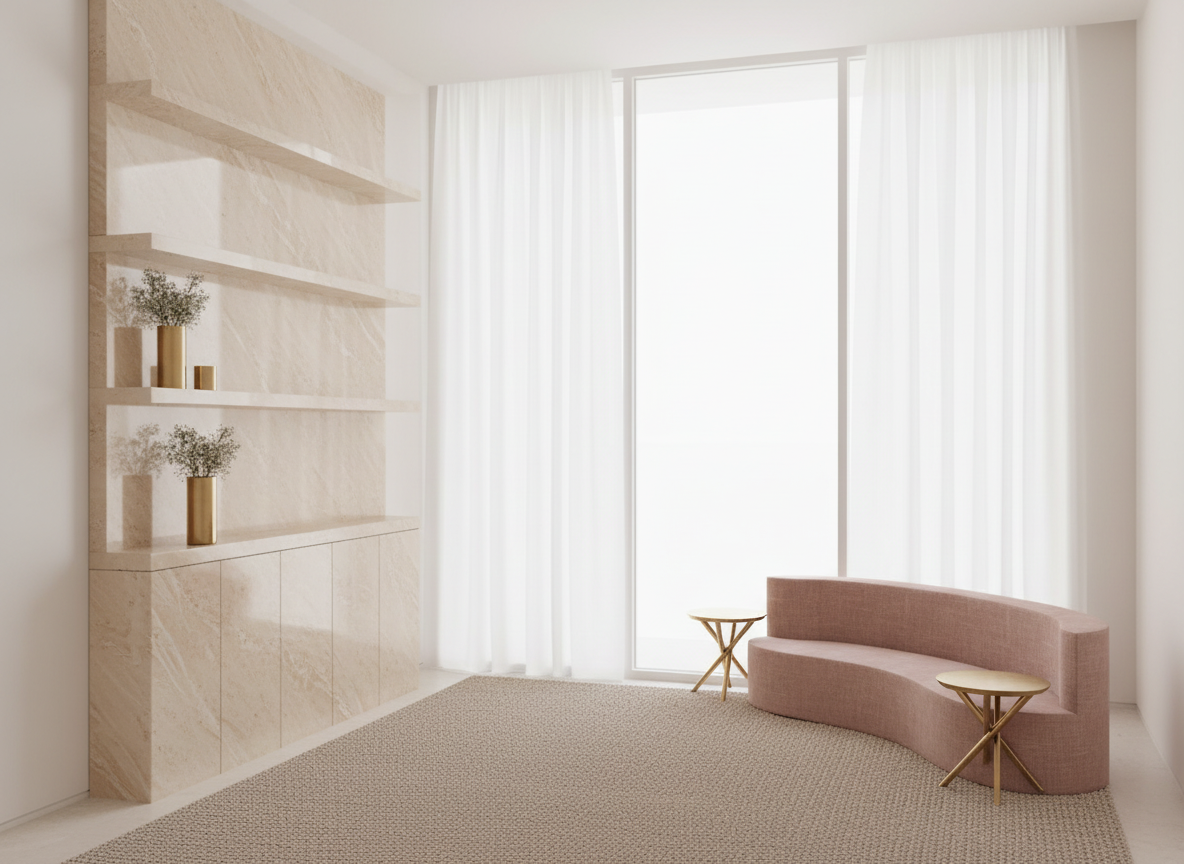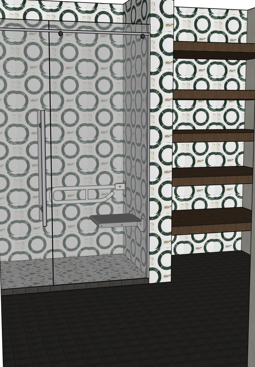 render a modern bathroom with an elegant glass shower featuring circular patterned tiles in soft teal and white the walls are adorned with a repeating design of teal rings on a white background giving a retro yet sophisticated vibe the floor is a sleek dark gray tile contrasting with the pattern of the shower wooden shelves in rich walnut add warmth and depth to the space illuminate the room with soft natural light creating a calm inviting atmosphere
