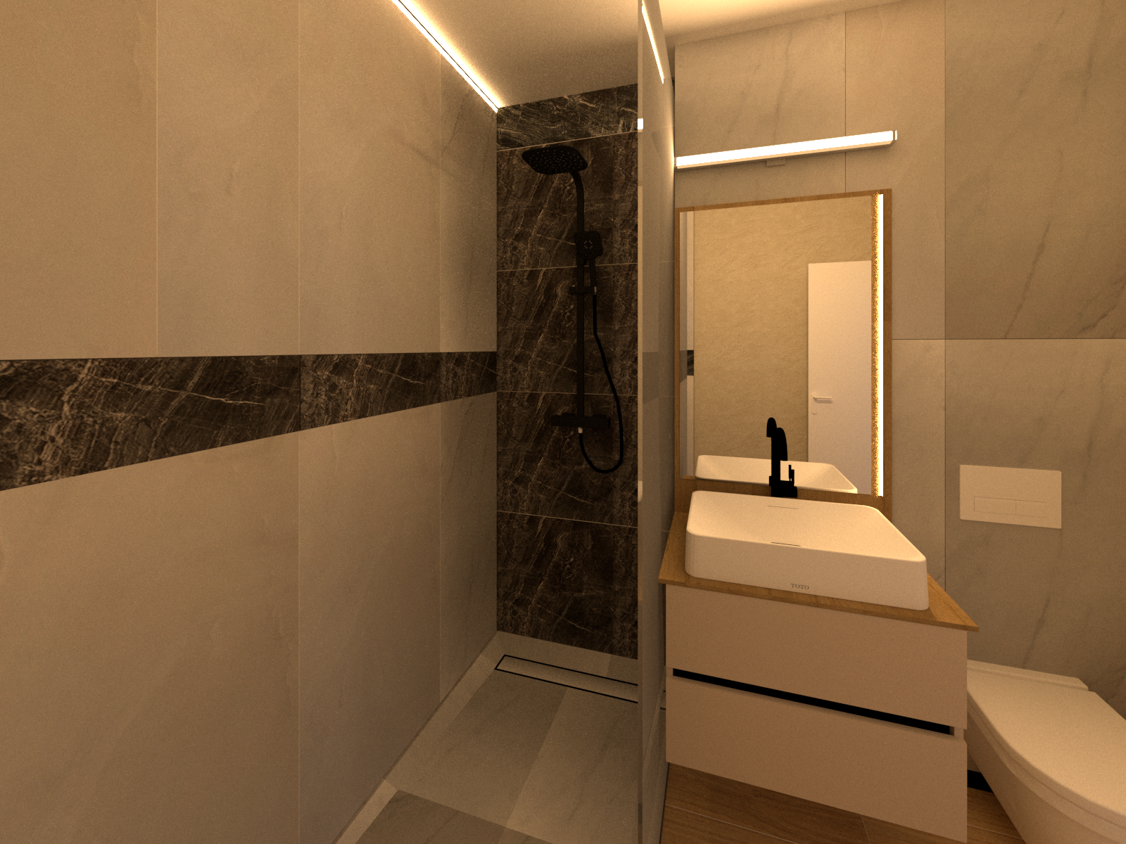 dont add sunlight reflections and stuff make the door handle black in the mirror reflection also the ceramic on the walls is reflective like laquer but don t put sun refelections in it just some light refelections from the room