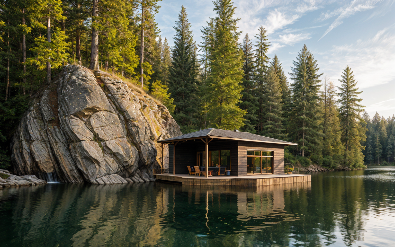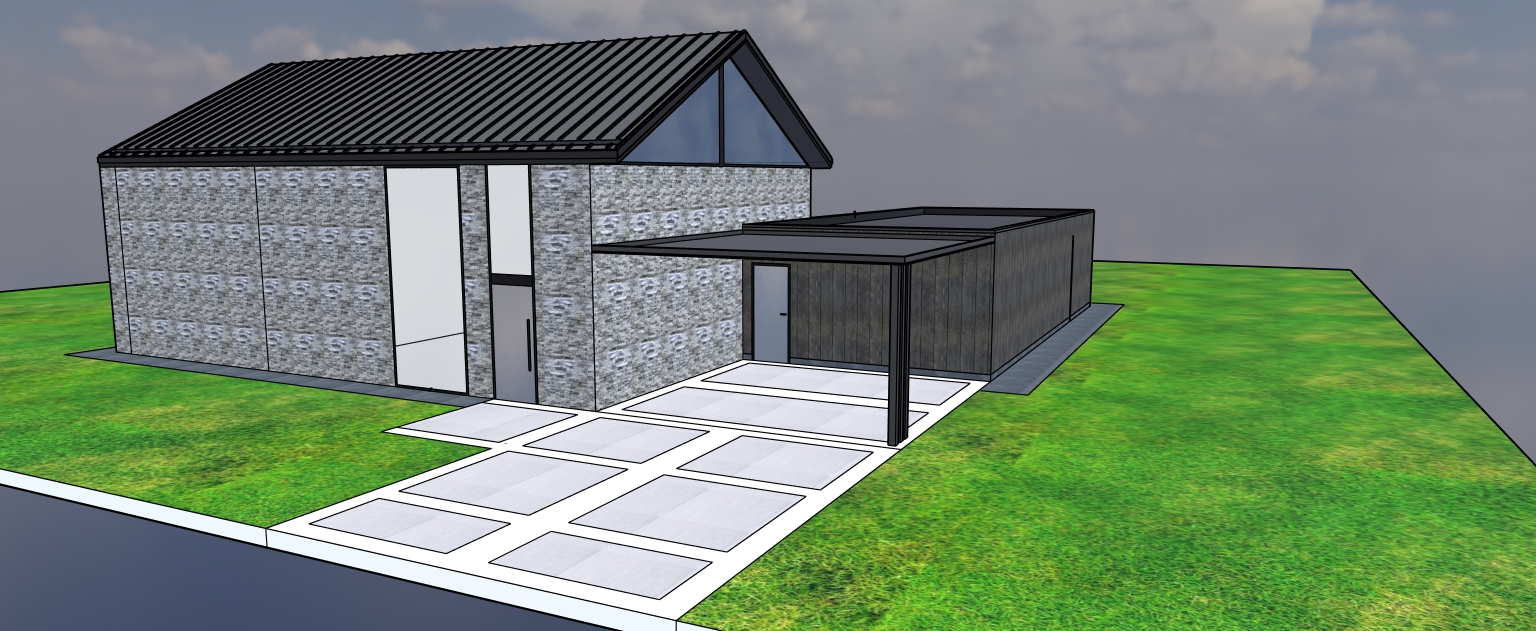 modernist exterior shot green woods low mountain carport stone wall driveway grass around the house architecture