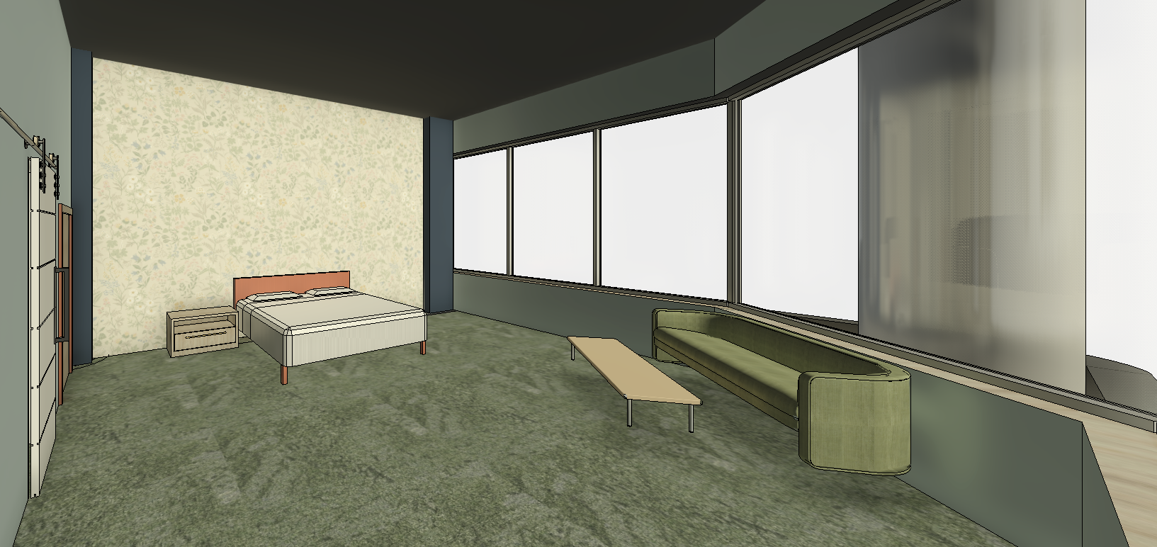 make this image of a king hotel suite using the attatched mood board keep the carpet and wallpaper the same make the bed headboard pink fabric make the oak accents textured add texture to the carpet change the couch color to a lighter green add a simple rug under the bed that is beige and simple add a painting over the bed