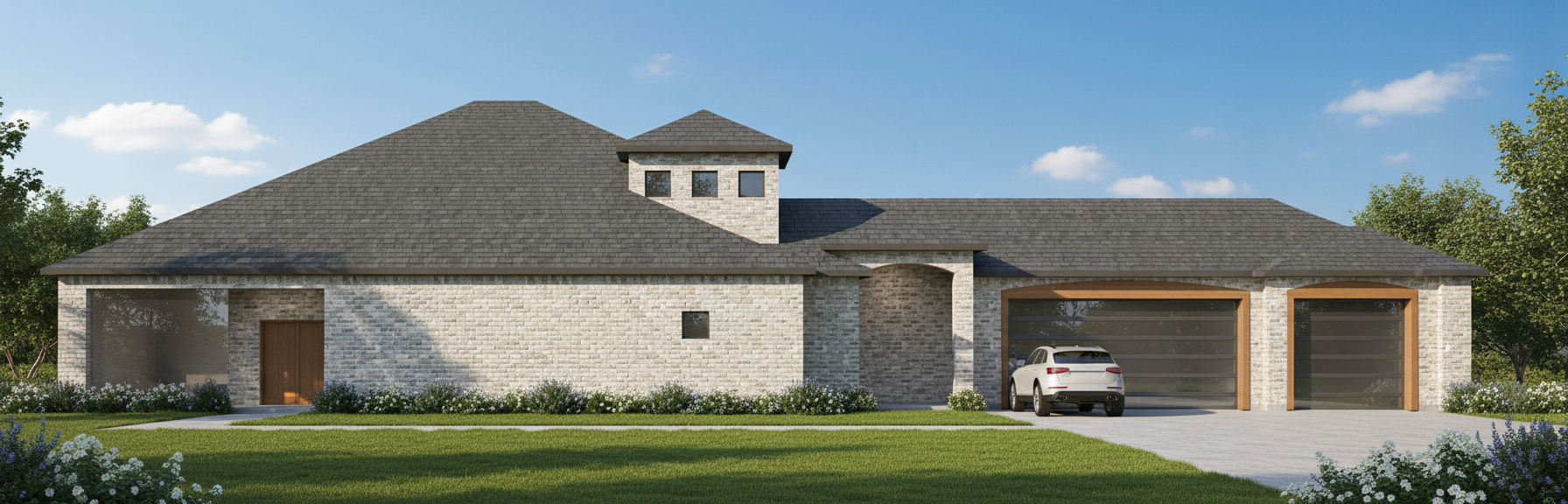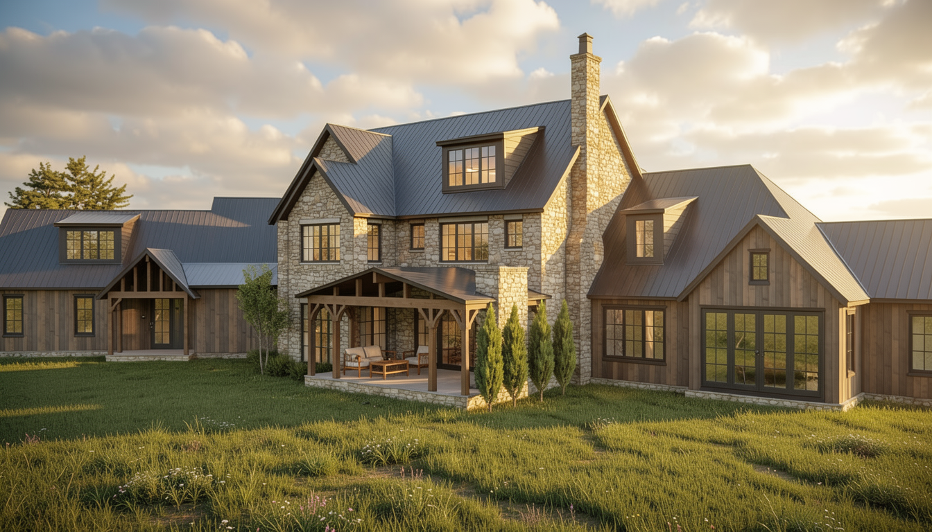 generate beautiful elevations renders with light inside with white stucco on front walls and black tile roof top down from above with sunlight at dusk