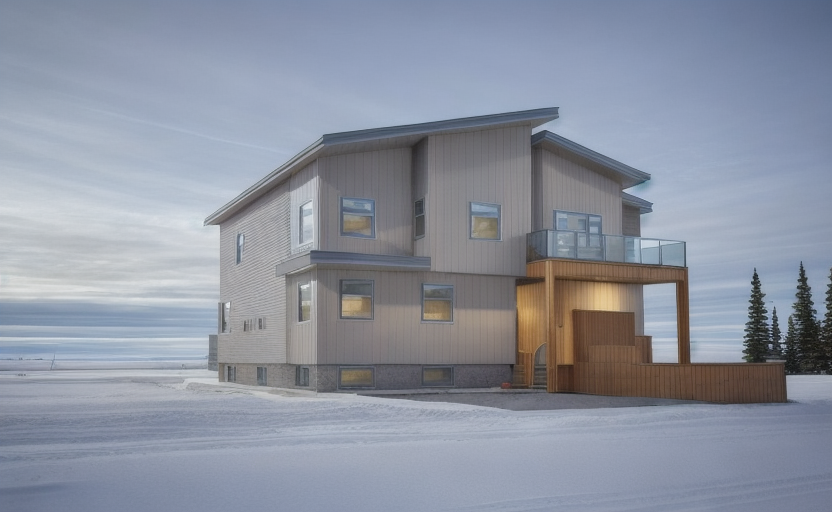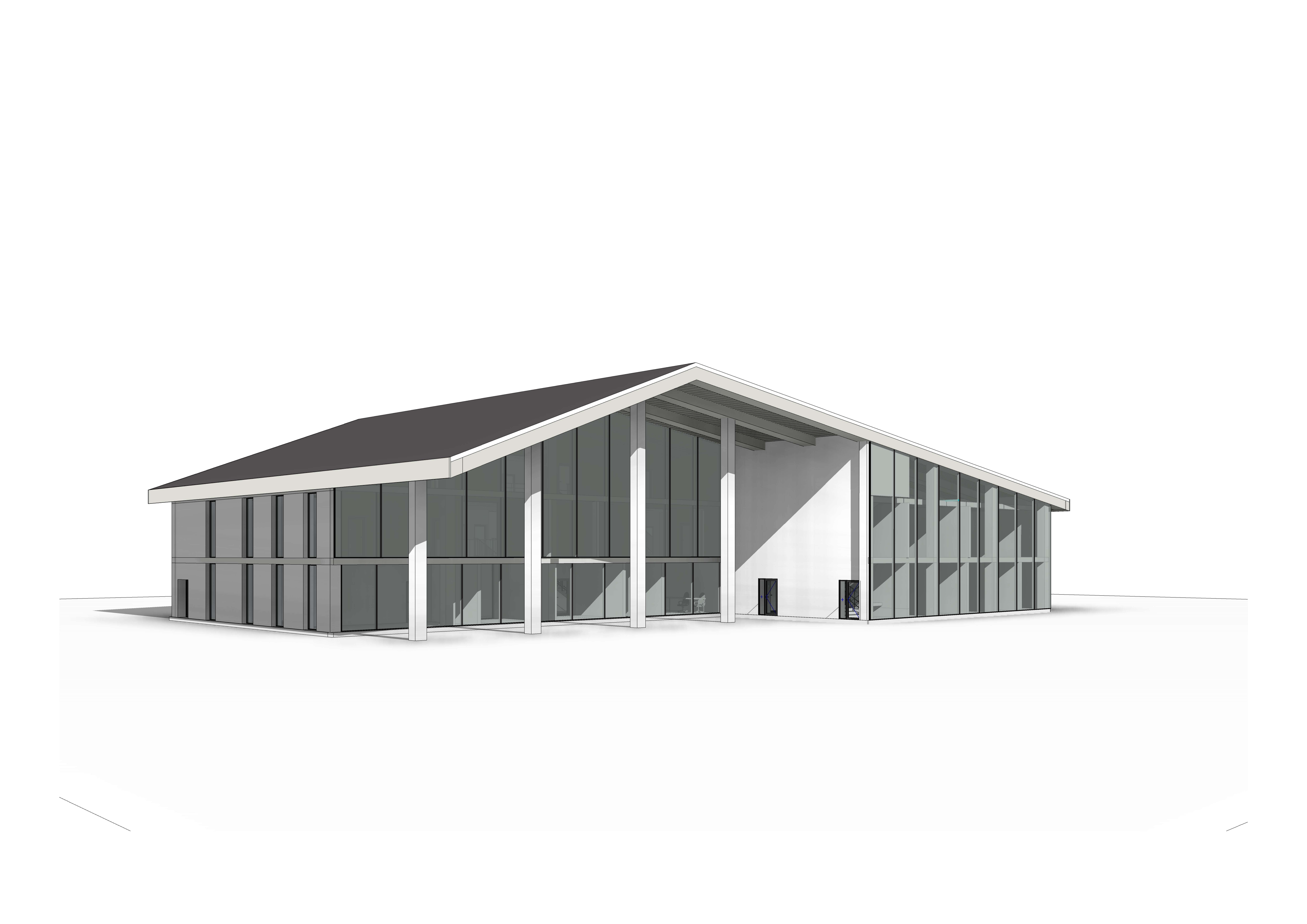 large public pavilion library dramatic cantilevered roof extending 4 5 meters exposed timber beams creating strong linear perspective fully glazed facade open public plaza under the roof wide welcoming entrance dynamic horizontal composition strong architectural gesture evening warm interior light people gathering monumental yet minimalist cinematic architectural rendering not small house not compact residential scale not simple gable cottage