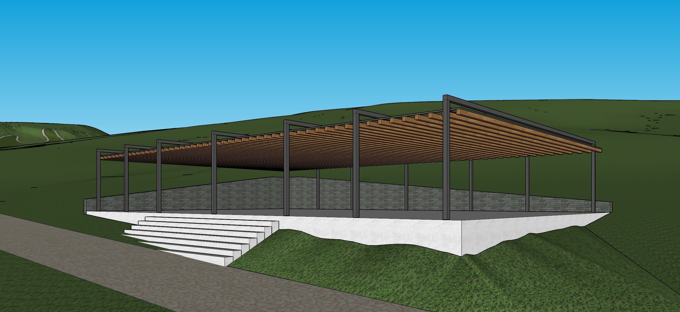 convierte este screenshot en una imagen hiperrealista el espacio es un salon al aire libre para clases de zumba que se encuentra en medio de un bosque con una topografia muy pronunciada la esctructura es de acero negro mate con un pergolado de madera y firme de concreto pulido el camino es un empedrado tipo limestone