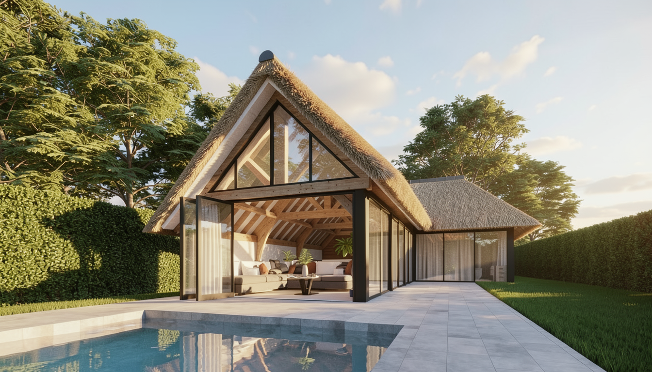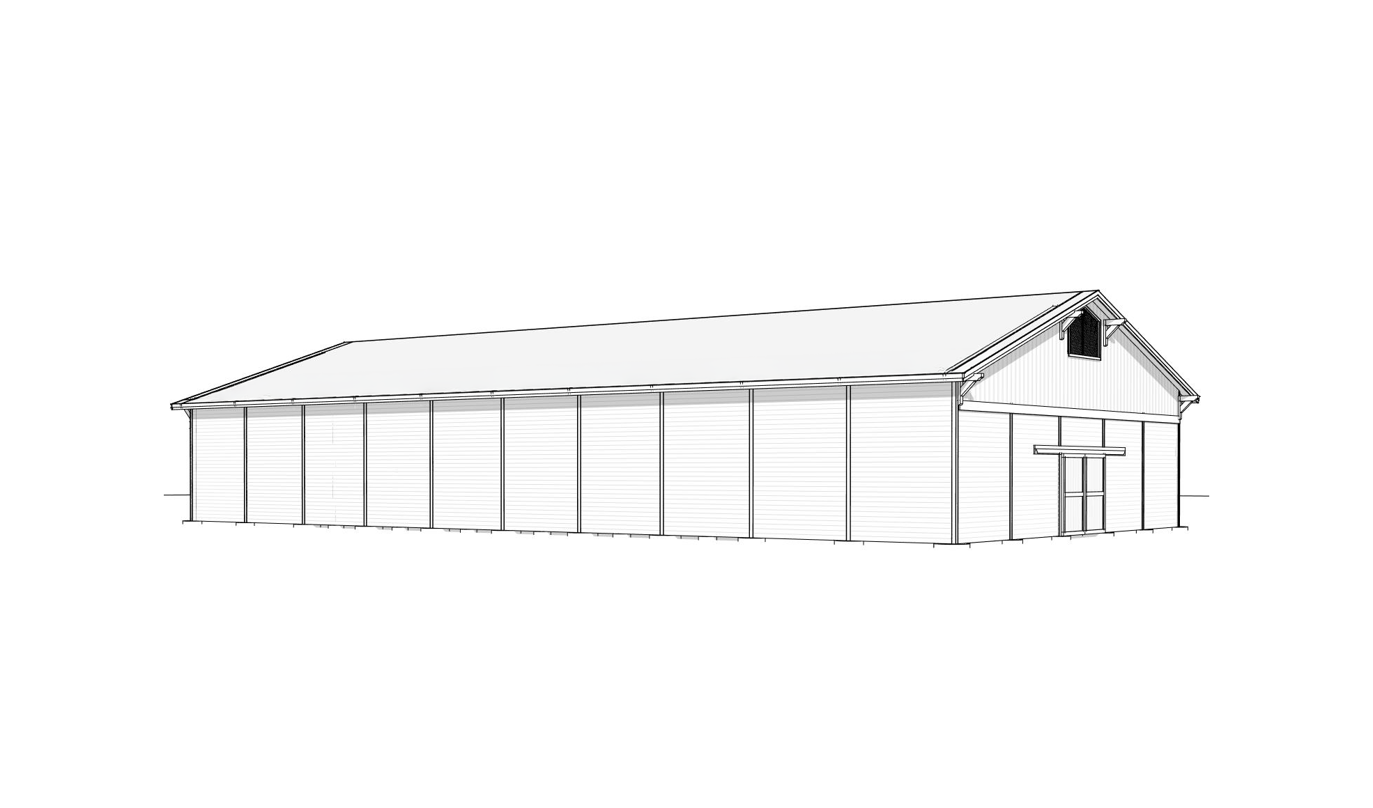 clean equestrian horseback riding arena architectural open air exterior arena rendered in cinematic golden hour lighting with blue skies and vibrant clouds enclosed horse arena in a lush beautiful forest setting with green grass and dense trees surrounding the property select grade horizontal cedar siding on the lower part of the structure and douglas fir board and batten on the upper portion of the arena green manicured landscape around structure with gardens and grass black standing seam metal roof high fidelity photorealistic visualization crisp shadow falloff refined facade geometry soft atmospheric depth premium architectural photography mood ultra clean composition and materials photorealistic render prominent trees scattered around the property black posts black trim around wood barn doors lower and upper sides of the structure have horizontal cedar wood siding